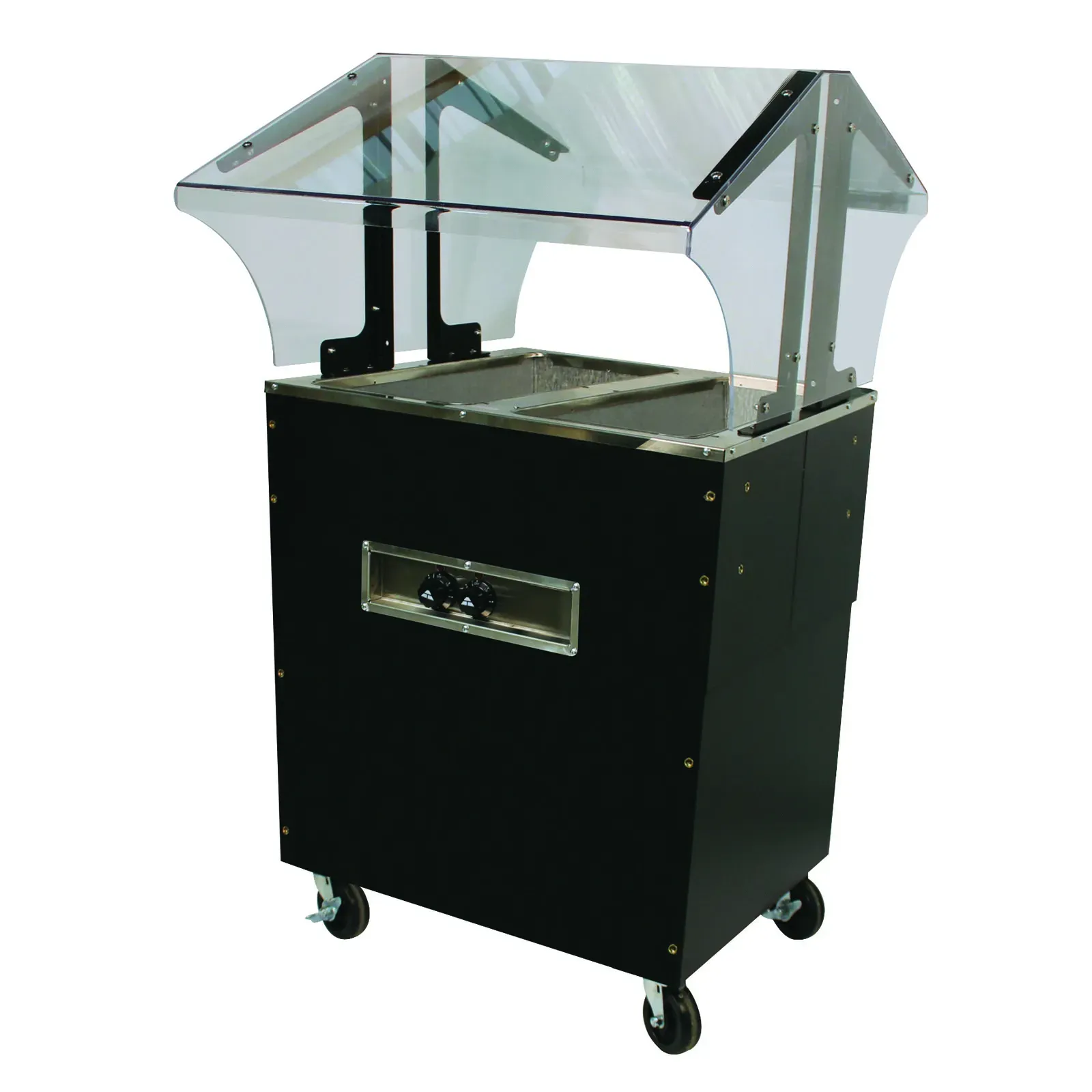 Elevate your restaurant' s productivity with the Advance Tabco Portable Hot Food Buffet Table. Designed to meet the high demands of a bustling restaurant environment, this versatile unit measures 31-13/16"W x 35"D x 53"H, making it a perfect fit for various dining settings. The Portable Hot Food Buffet Table features a double-sided sneeze guard, ensuring food safety and hygiene from all angles. Equipped with (2) 12" x 20" galvanized wells, it requires spillage pans to maintain optimal food temperatures and cleanliness. Each well is controlled individually with infinite controls and indicator lights, allowing for precise temperature management to keep your dishes at their best. The enclosed base provides a sleek, professional appearance, complemented by a durable black vinyl clad finish that resists wear and tear. Mobility is a breeze with 4" swivel casters, two of which come with brakes for secure positioning. This makes the Portable Hot Food Buffet Table an excellent choice for both permanent and temporary setups. Certified by UL and NSF, this unit operates on 208-240v, ensuring it meets rigorous safety and sanitation standards. The Advance Tabco Portable Hot Food Buffet Table, model B2-240-B-SB, is an indispensable addition to any restaurant looking to enhance its buffet service with reliability and style.