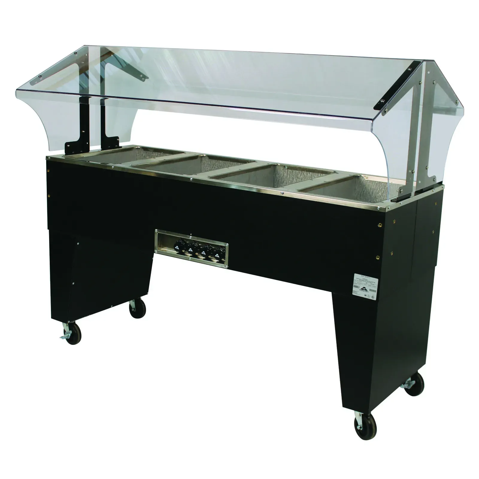 The open base design provides easy access for staff, while the black vinyl clad finish adds a touch of elegance to your dining area. Mobility is a breeze with the 4" swivel casters, two of which have brakes for secure positioning. This unit is UL and NSF certified, ensuring it meets the highest standards of safety and sanitation.