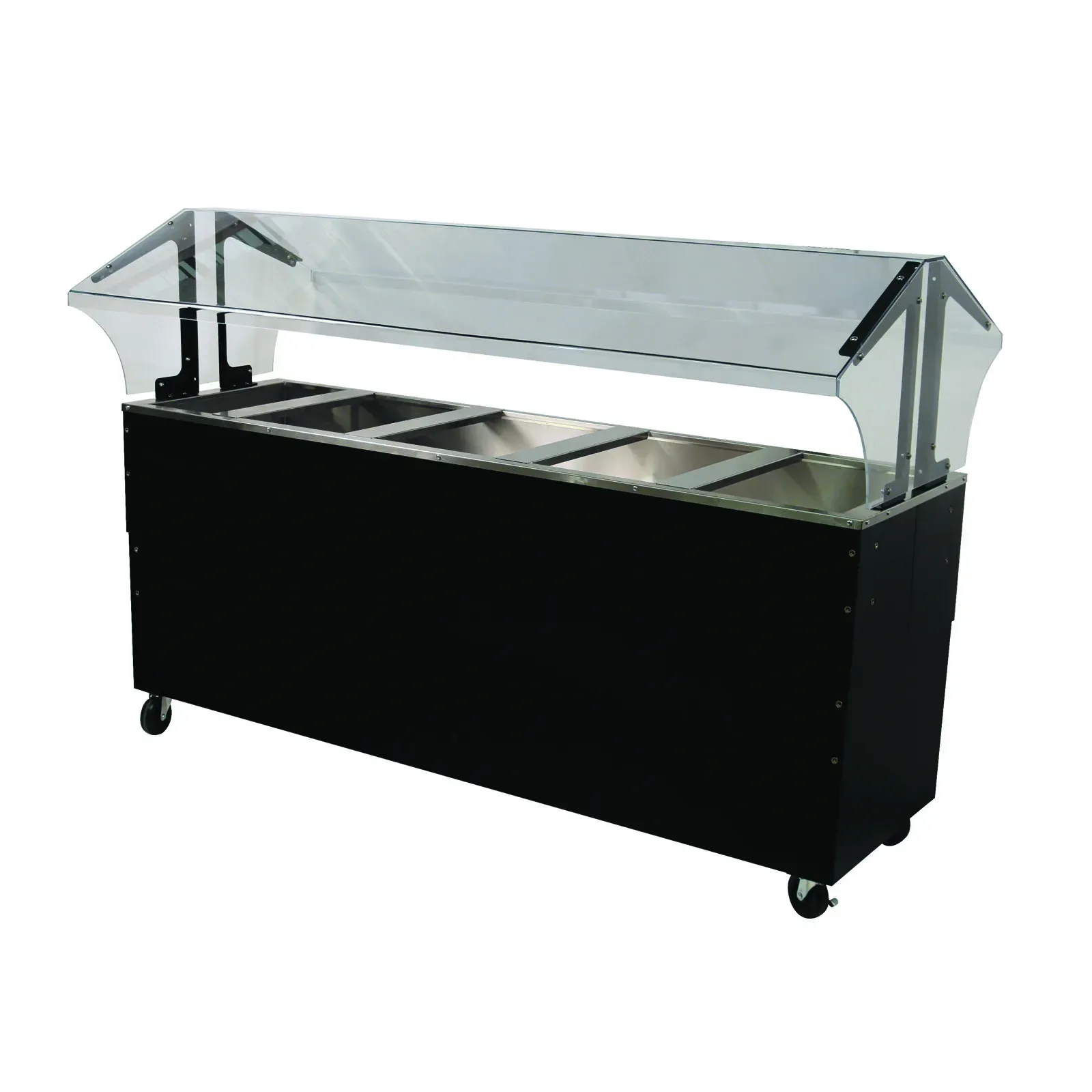 Upgrade your kitchen' s versatility with the Advance Tabco Ice Cooled Portable Food Buffet Table. This robust and stylish buffet table, model B5-CPU-B-SB, is designed to meet the dynamic needs of any restaurant setting. Measuring 77-3/4" wide, 35" deep, and 53" high, it offers ample space for a variety of food presentations. The Ice Cooled Portable Food Buffet Table features a double-sided sneeze guard, ensuring hygiene and safety for your guests. It accommodates up to five 12" x 20" pan inserts, each up to 6-1/4" deep, with additional space below for ice, making it perfect for keeping your dishes chilled and fresh. The 8" deep well and 1" IPS drain facilitate easy cleaning and maintenance, ensuring your operations run smoothly. The enclosed base with a black vinyl clad finish not only adds a sleek look to your establishment but also provides durability and ease of cleaning. Mobility is a breeze with four 5" swivel casters, two of which come with brakes, allowing you to position the buffet table wherever needed and secure it in place. NSF certified, the Advance Tabco Ice Cooled Portable Food Buffet Table is a reliable and practical addition to any restaurant, enhancing both functionality and presentation. Elevate your food service experience with this versatile and essential piece of equipment.