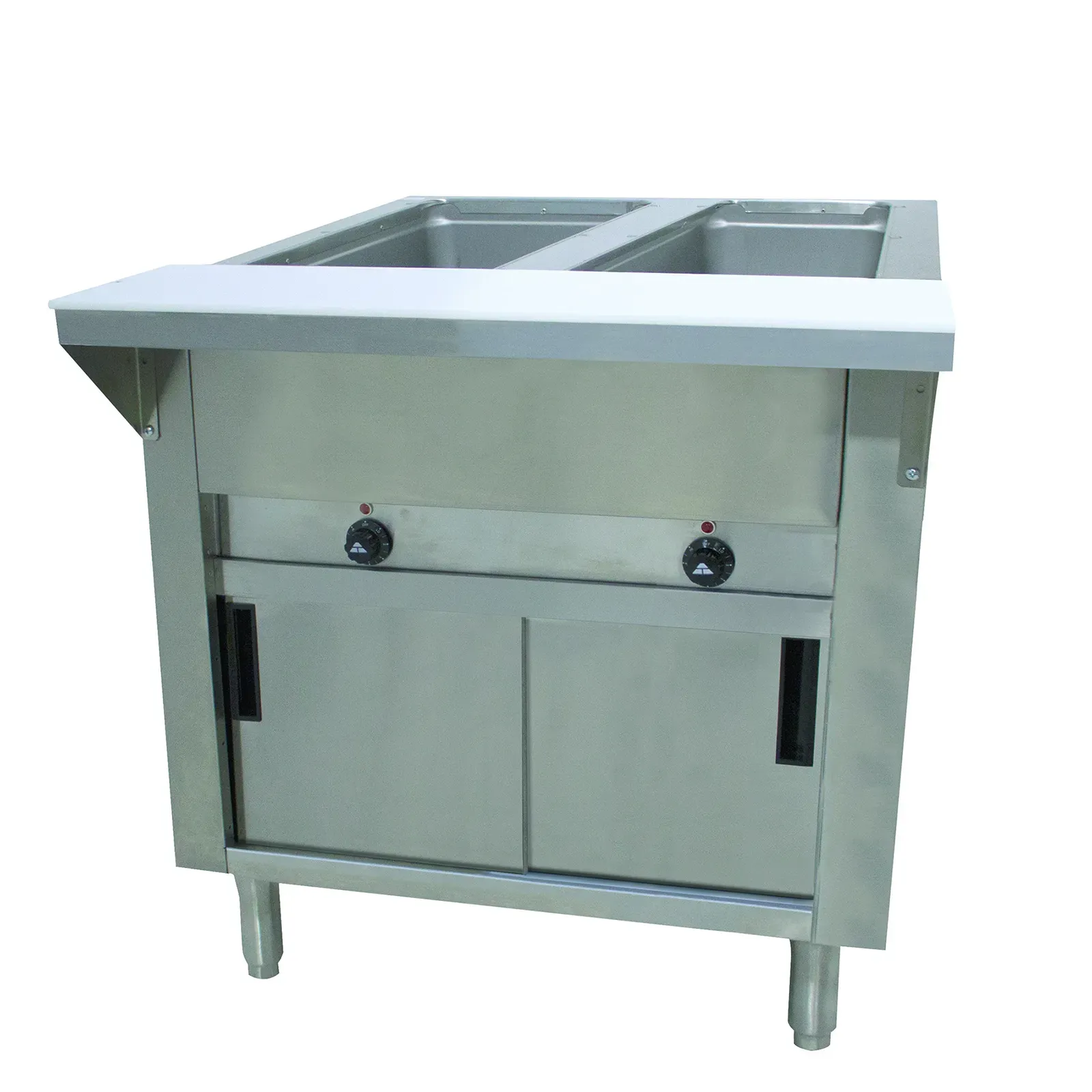 The unit also includes a stainless steel 8D support shelf with a removable 3/8" thick poly cutting board, offering additional prep space and convenience. The stainless steel cabinet base with (2) sliding doors provides ample storage for kitchen essentials, keeping your workspace organized and clutter-free.