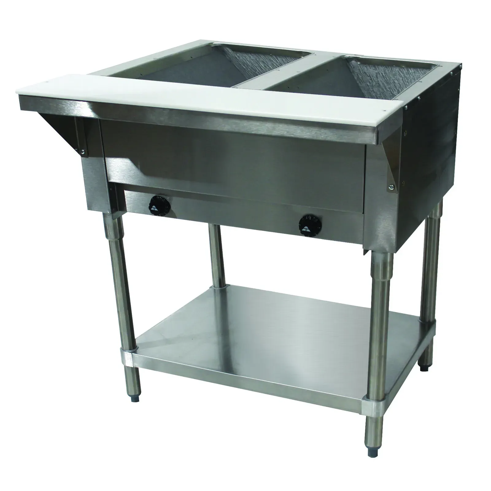Enhance productivity and organization using the Advance Tabco Hot Food Table. This high-quality unit, model HF-2G-LP, is designed to meet the demanding needs of a busy restaurant environment. With dimensions of 31-13/16"W x 30-5/8"D x 34-3/8"H, it offers a compact yet efficient solution for keeping food warm and ready to serve. The Advance Tabco Hot Food Table features (2) 12" x 20" hot food wells, each equipped with individual controls that offer three settings, allowing for precise temperature management. The pilot indicator opening ensures easy monitoring, while the 7000 BTU output guarantees consistent heating performance. Constructed with a durable stainless steel top, this hot food table is built to withstand the rigors of daily use. The stainless steel 8D support shelf, complete with a removable 3/8" thick poly cutting board, provides additional workspace and convenience. The galvanized open base with an undershelf offers ample storage for kitchen essentials, enhancing overall efficiency. Certified by CSAus and NSF, the Advance Tabco Hot Food Table meets stringent safety and sanitation standards, making it a reliable choice for any professional kitchen. Whether you're running a bustling restaurant or a catering service, this hot food table is an indispensable asset that ensures your dishes are served at the perfect temperature every time.