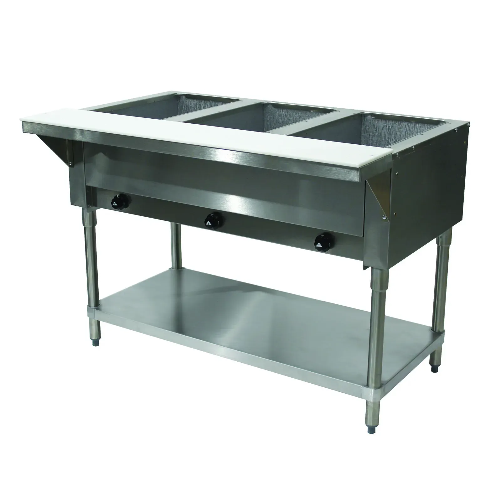 Constructed with a stainless steel top and an 8D support shelf, this hot food table is built to last. The removable 3/8" thick poly cutting board adds versatility, providing a convenient prep area right where you need it. The galvanized open base with an undershelf offers additional storage, keeping your kitchen organized and efficient.
