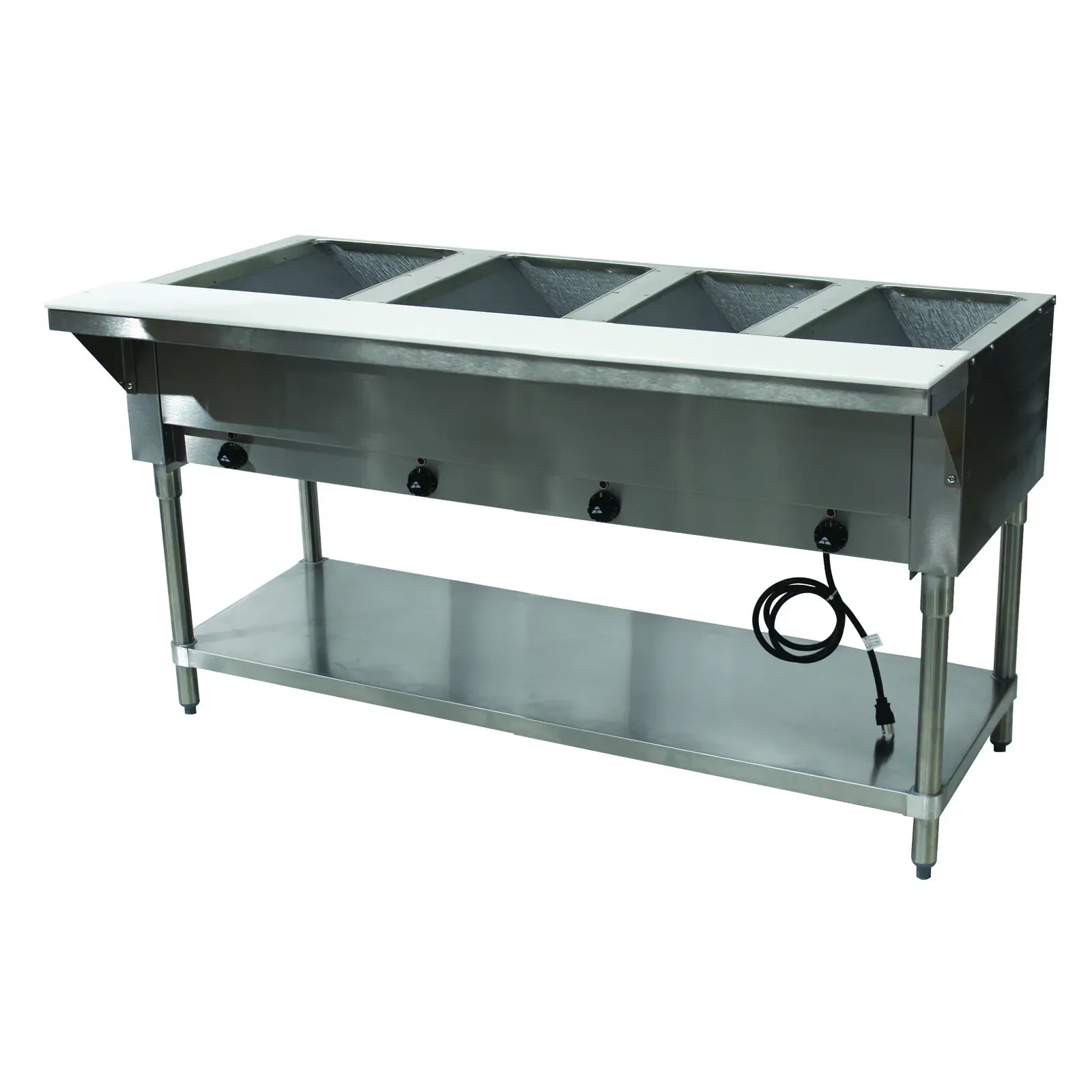 Upgrade your workspace with the Advance Tabco Hot Food Table, a top-tier solution designed to meet the demanding needs of any restaurant setting. The HF-4E-120 model boasts a robust construction with dimensions of 62-7/16"W x 30-5/8"D x 34-3/8"H, making it a perfect fit for your kitchen. This Hot Food Table features four 12" x 20" wells, each capable of accommodating pan inserts up to 7-3/4" deep. This allows for versatile food holding and serving options, ensuring your dishes stay warm and ready for service. Each well is equipped with individual infinite controls, giving you precise temperature management for each dish. Crafted with a stainless steel top, the Advance Tabco Hot Food Table ensures durability and easy cleaning, essential for maintaining hygiene standards in a busy kitchen. The stainless steel 8D support shelf comes with a removable 3/8" thick poly cutting board, providing additional workspace for food preparation. The galvanized open base with an undershelf offers ample storage space for your kitchen essentials, keeping your workspace organized and efficient. Certified by UL and NSF, this Hot Food Table meets the highest safety and sanitation standards, making it a reliable addition to your kitchen. Elevate your restaurant's efficiency and food quality with the Advance Tabco Hot Food Table. Its superior design and functionality make it an indispensable asset for any professional kitchen.