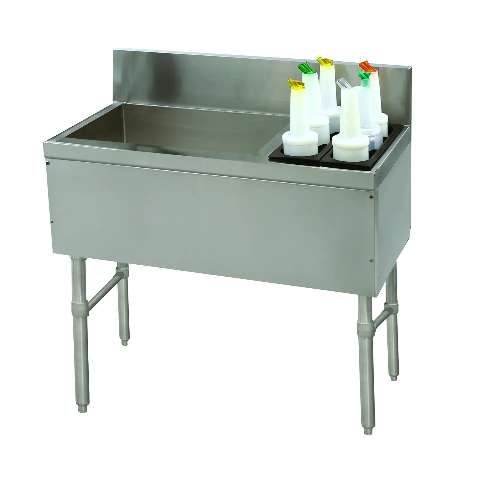 Constructed from 20 gauge 300 series stainless steel with foam insulation, this ice chest is built to last, resisting corrosion and maintaining temperature. The stainless steel legs and adjustable bullet feet ensure stability on any surface, while the soda chase provision in the top of the backsplash offers a convenient solution for managing soda lines.