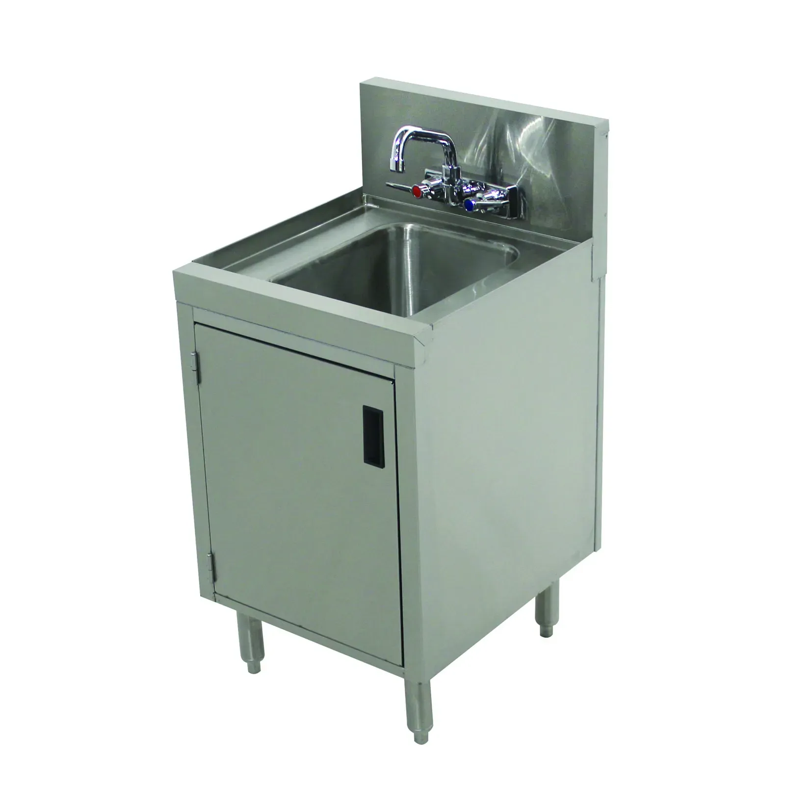 The Prestige Hand Sink features a 10"W x 14"D x 7" deep sink bowl, offering ample space for thorough handwashing. The 7" backsplash helps to keep your kitchen walls clean and sanitary, preventing water splashes and potential contamination. The cabinet base with a hinged door provides convenient storage for cleaning supplies or other essentials, keeping your workspace organized and clutter-free.