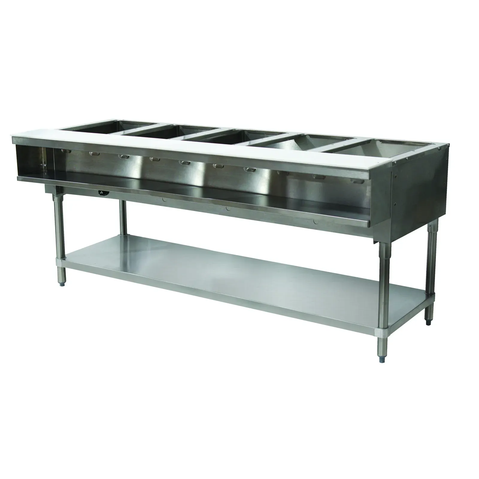 The Advance Tabco Water Bath Hot Food Table features five 12" x 20" well openings, accommodating pan inserts up to 7-3/4" deep, making it versatile for different menu items. The stainless steel top ensures durability and easy cleaning, essential for maintaining hygiene standards in a busy kitchen. Additionally, the 8"D x 3/8" thick poly cutting board with a stainless plate shelf below provides a convenient prep area, streamlining your kitchen workflow.