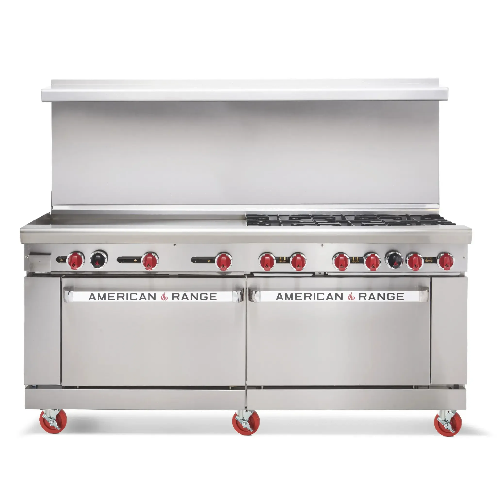 Elevate your kitchen game effortlessly with the American Range AR-8B-24RG. This heavy-duty restaurant range is designed to meet the demands of a commercial restaurant setting. With its 72" size and 8 powerful 32,000 BTU open burners, you'll have plenty of cooking space and heat to prepare multiple dishes simultaneously. The range also features a 24" raised griddle/broiler with manual controls, perfect for searing steaks or grilling sandwiches to perfection. Two 26-1/2" ovens with one rack each provide ample baking space for your culinary creations. Made in the USA with stainless steel front, sides, and high shelf, this range is built to last. The ETL-Sanitation certification ensures the highest standards of cleanliness and safety. Upgrade your restaurant kitchen with the American Range AR-8B-24RG and experience professional-grade performance.