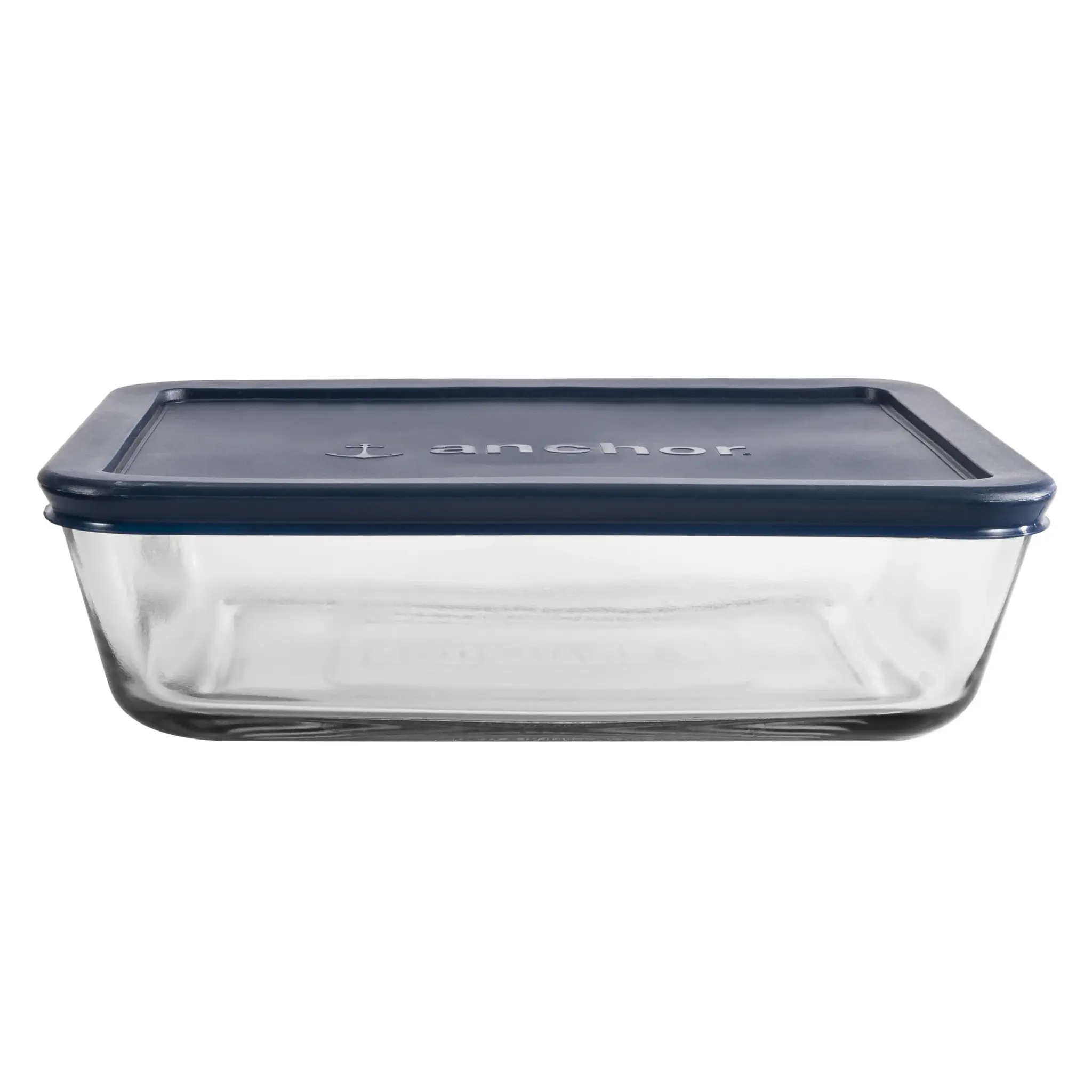 Crafted from fully tempered glass, this clear container offers exceptional durability and resistance to thermal shock, ensuring it can withstand the daily hustle and bustle of your kitchen. The blue plastic lid provides a secure, airtight seal, keeping your food fresh and protected from contaminants. Its rectangular shape allows for efficient stacking and space-saving storage in your refrigerator or pantry.