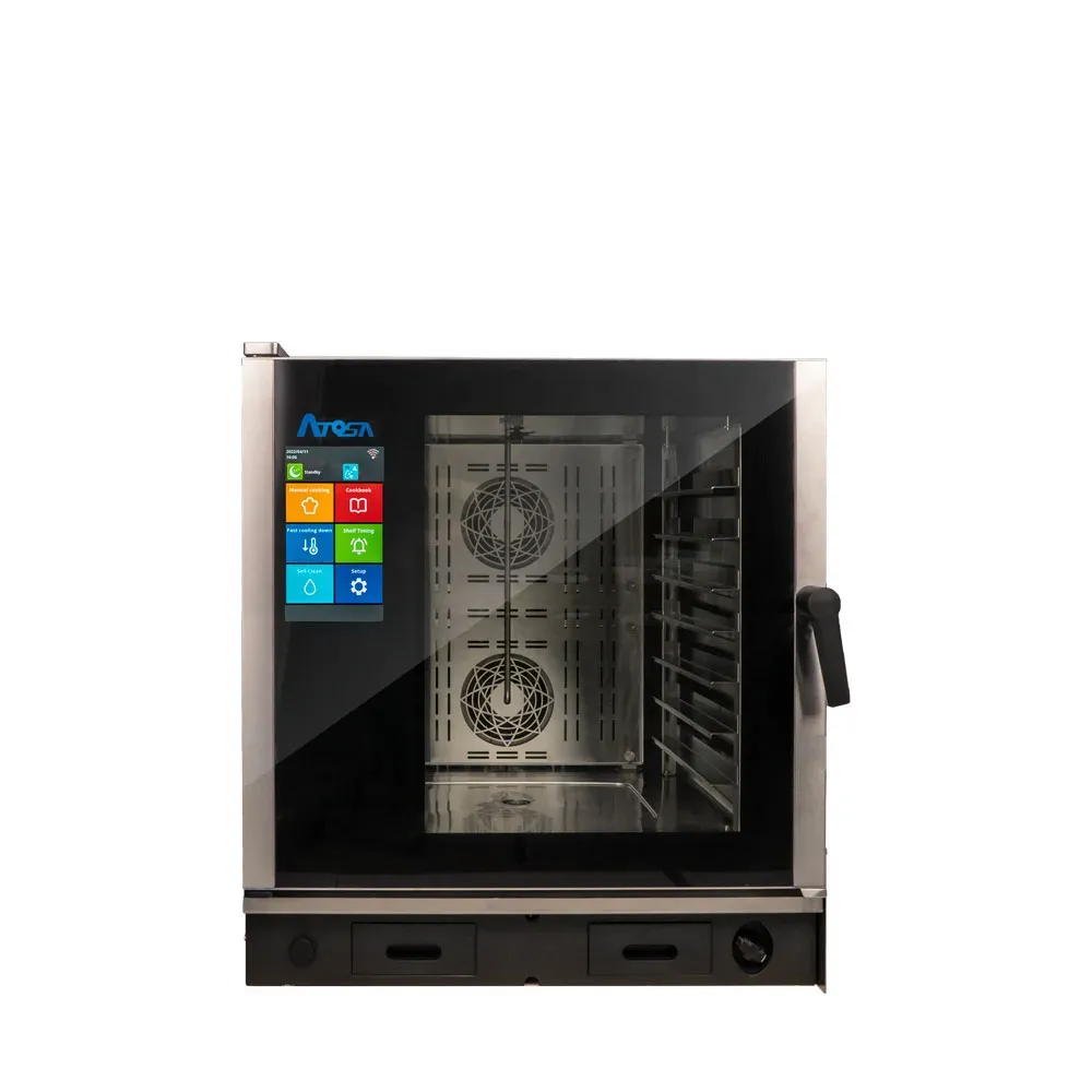 Electric Combi Oven,Fits 7-Pan Half-Size OR GN 1/1 Pan,Dimensions: 30 W * 34 D * 35 H,10 Smart Touch Flat Screen - Large cooking process icons with clear colorful and vibrant graphics,ATOSA Combi Smart Cooking - Automated cabinet monitoring to maintain cooking temperature humidity and load size,Combi Smart Touch Processes - User friendly / easy access to programmable multi-stage cooking,manual cooking core probe cooking and menu options,8 Fan Speed with Balance Reverse,Perfect Humidity Control - An automatic system designed for maximizing steam saturation and humidity control,Sub-divided Heating System - For maximum recovery,Smart Touch Rack Timing - For mixed load batch cooking banquets buffet and a la carte restaurant service,USB Storage - Share Combi recipes programs and HACCP data with multiple operation units and locations,Wi-Fi Connection - Remotely monitor Combi operating status in real time with fault alarm via tablet or smart phone*,Wi-Fi Self Diagnostics Protection - Safety protections to protect and ensure oven remains in safe working order*,Wi-Fi Service Diagnostics - Remote service tech diagnostics and component trouble shooting*,6 Mode Automated Combi Wash - Cleaning based on soil and usage to include automatic shut down and un-lock when finished,Twin Chemical Fill Tanks - Combi automatically reminds user to add cleaner / rinse to tanks when low without the need to check at time of cleaning,Sleek Design - Triple-pane tempered glass,condensed footprint,convenient for cleaning and maintenance,Footless Combi Design - Ergonomic footing for stability and placement,High-Pressure Coil Wash Hose - Ideal for manual quick flush quench rinsing and cabinet quick cleaning,*Wi-Fi features not yet available coming soon!