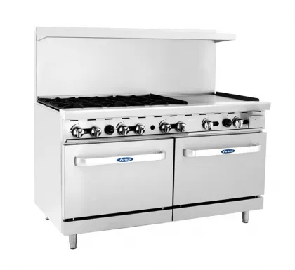 Unleash your kitchen's potential with the Atosa USA AGR-6B24GR 60" Combination Gas Range. This top-of-the-line range is designed to meet the demands of a busy commercial restaurant kitchen. With its six 32,000 BTU open burners, you'll have plenty of cooking power to handle multiple dishes at once. Each burner comes with a standing pilot for easy ignition, ensuring quick and efficient cooking. On the right side, you'll find a 24" wide, 3/4" thick polished steel griddle, perfect for cooking up delicious breakfast items or searing meats to perfection. The two 26-1/2" wide ovens feature adjustable chrome oven racks and an oven pilot with safety shut off for added convenience and peace of mind. Made with high-quality stainless steel, this range is built to last and withstand the rigors of a busy kitchen. Plus, with its casters, it's easy to move and clean around. Upgrade your kitchen with the Atosa USA AGR-6B24GR 60" Combination Gas Range and experience the difference in performance and durability.