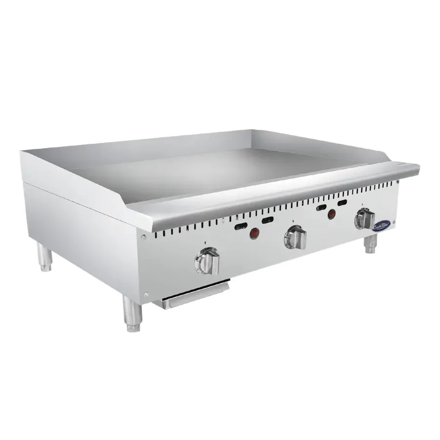 Fuel your passion for cooking with the Atosa USA ATTG-36 Gas Countertop Griddle. This heavy-duty griddle is designed to meet the demands of a commercial restaurant kitchen. With a spacious cooking area of 35-7/10"W x 19-9/10"D, you'll have plenty of room to cook multiple dishes at once. The 1" thick griddle plate ensures even heat distribution for consistent cooking results. Equipped with three stainless steel burners and standby pilots, this griddle offers a total of 75000 BTU's of power. The thermostatic controls allow you to easily adjust the temperature to suit your cooking needs. Made with a stainless steel structure, this griddle is built to withstand the rigors of a busy kitchen. The adjustable stainless steel legs provide stability and allow for easy cleaning underneath. Trust Atosa USA for reliable and high-quality commercial kitchen equipment.