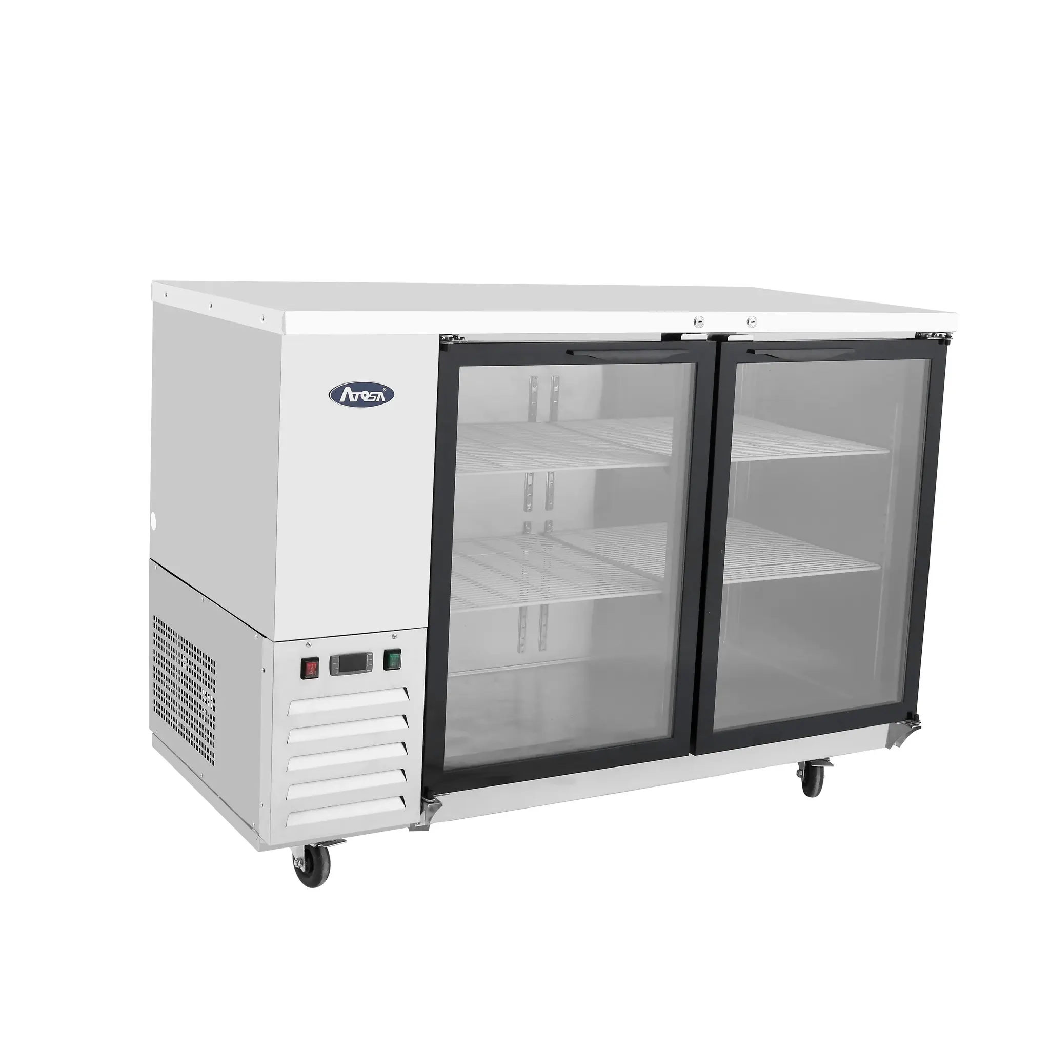 Achieve kitchen supremacy with the Atosa USA, MBB48GGR Back Bar Cabinet. This two-section refrigerated cabinet is designed to meet the demands of a commercial restaurant, providing optimal storage and cooling capabilities. With its self-contained side mount refrigeration system and 12.9 cu. ft. capacity, this cabinet ensures that your beverages and ingredients stay at the perfect temperature. The two locking glass doors not only provide easy access to the contents but also allow for a clear view of the items inside, making it convenient for staff to locate what they need quickly. The digital temperature control ensures precise temperature management, while the four epoxy coated shelves offer ample space for organization. Made with a stainless steel interior and exterior, this cabinet is not only durable but also easy to clean. With its 2" casters, it can be easily moved around the kitchen as needed. Trust Atosa USA to deliver high-quality refrigeration solutions for your commercial restaurant needs.