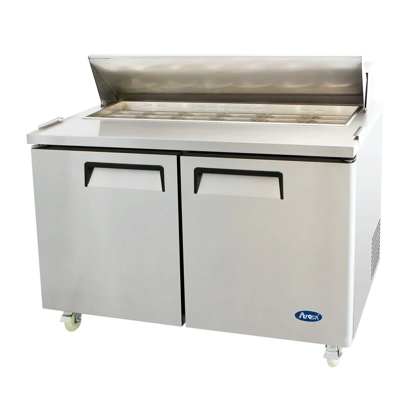 Introducing the Atosa USA, MSF8303GR Refrigerated Counter, Sandwich / Salad Unit - the perfect addition to drive restaurant profitability. This two-section refrigerator is designed to meet the demands of a busy commercial kitchen. With its spacious 17.2 cu. ft. capacity, it provides ample storage for all your sandwich and salad ingredients. The unit comes with 16 stainless steel pans, allowing you to organize your ingredients efficiently. The rear-mounted, self-contained refrigeration system ensures consistent cooling, while the digital temperature control allows you to set the temperature between 33° to 40°F. The two solid hinged self-closing doors and adjustable shelves make it easy to access and organize your items. The 10" poly cutting board provides a convenient workspace for food preparation. Made with a stainless steel interior and exterior, this unit is not only durable but also easy to clean. With its automatic evaporation and air defrost features, maintenance is a breeze. The 5" casters make it easy to move the unit around your kitchen. Trust Atosa USA to deliver high-quality refrigeration solutions that enhance your restaurant's efficiency and profitability.