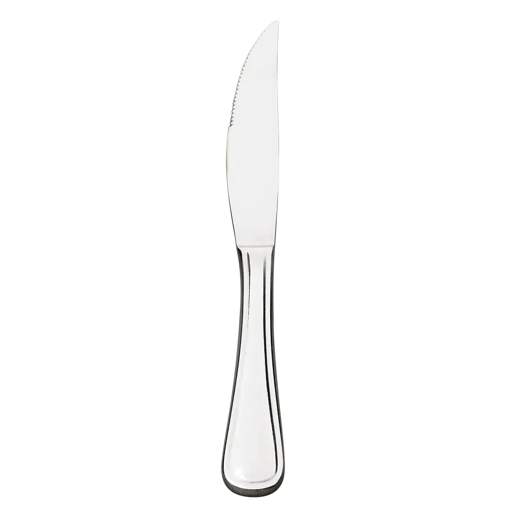 Enhance your commercial restaurant with the Browne Foodservice 502412 Flatware 18/10 - CONCERTO Flatware. This versatile solution is designed to elevate your dining experience. With its sleek and modern design, this flatware set adds a touch of elegance to any table setting. The serrated 9.3"/23.5cm steak knife ensures effortless cutting, making it perfect for serving succulent steaks to your discerning customers. Crafted with high-quality 18/10 stainless steel, this flatware set is durable and resistant to corrosion, ensuring long-lasting use. Upgrade your restaurant's dining experience with this exceptional flatware set.