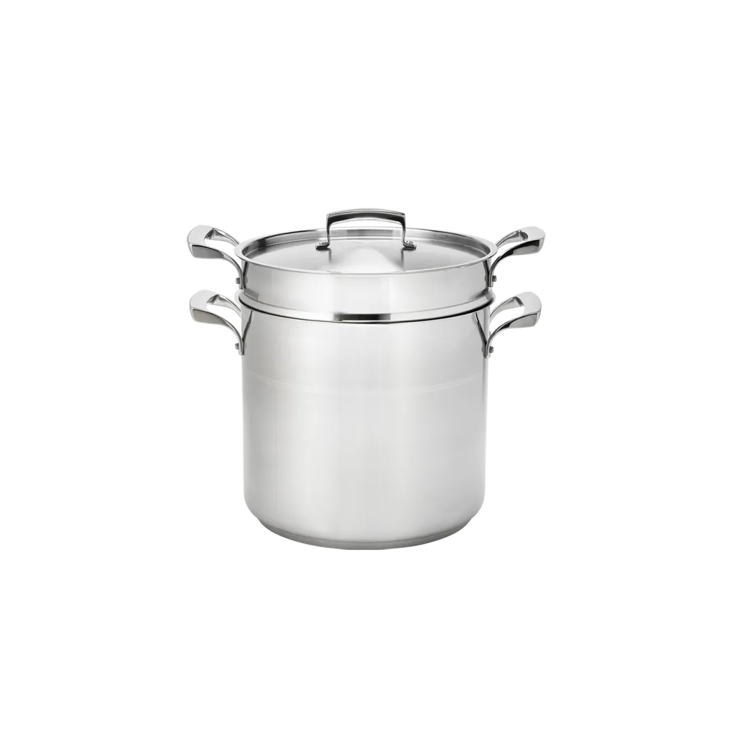 Transform your commercial kitchen with the Browne Foodservice 5724068 Cookware - THERMALLOY Stainless. This high-quality 9 qt SS Double Boiler set is a must-have for any professional chef. Designed with durability in mind, it is made from premium stainless steel that is NSF certified, ensuring it meets the highest standards of cleanliness and safety. The set includes three pieces, allowing for versatile cooking options and efficient preparation of delicate sauces, custards, and chocolates. With its large capacity, this double boiler is perfect for commercial restaurant use, allowing you to easily handle large quantities of ingredients. Upgrade your kitchen today and experience the difference this double boiler set can make in your culinary creations.