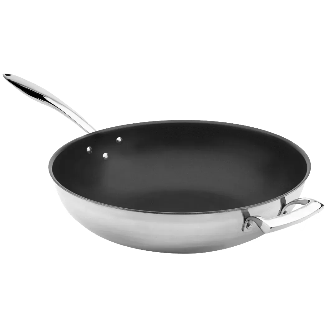Introducing the Browne Foodservice, 5724104, Cookware - THERMALLOY Clad Tri-Ply, designed to modernize your commercial restaurant kitchen for efficiency and excellence. This 14"/36cm wok is a game-changer, offering a generous 9qt/9.6L capacity to handle large quantities of food with ease. Crafted with THERMALLOY Clad Tri-Ply construction, this wok ensures even heat distribution, preventing hot spots and allowing for precise cooking. The stainless steel material not only guarantees durability but also makes it easy to clean, saving you valuable time in a busy kitchen. With its Excalibur non-stick coating, food release is effortless, reducing the need for excessive oil and promoting healthier cooking. Whether you're stir-frying, sautéing, or deep-frying, this wok is a versatile tool that will elevate your culinary creations. Trust Browne Foodservice, a reputable vendor known for their quality products, to provide you with the best cookware for your commercial restaurant needs.