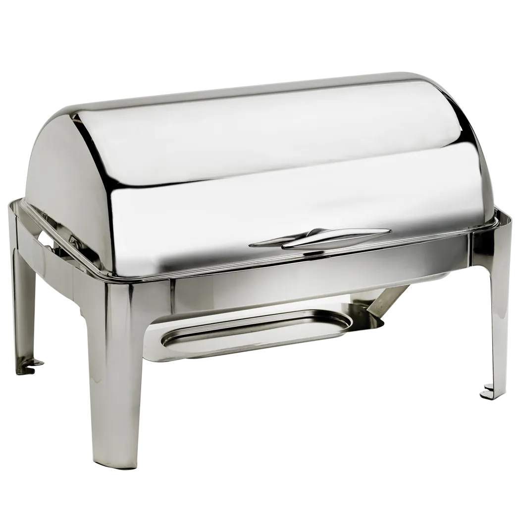 Upgrade your restaurant's capabilities with the Browne Foodservice 575137 Chafers & Dispensers - Premium Chafers. This high-quality chafer is designed to elevate your food presentation and keep it warm for longer periods. The Cadence Full Size Rectangular Chafer comes with a convenient roll top cover, allowing easy access to the food while maintaining its temperature. With its sleek and durable design, this chafer is perfect for commercial restaurant use.