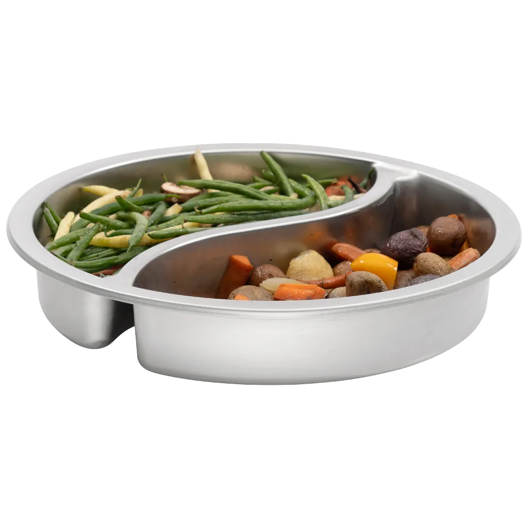 Elevate the experience with essentials for your commercial restaurant with Browne Foodservice's Chafers & Dispensers - Chafer Accessories. Introducing the Browne Foodservice, 575165, a YING YANG Round Divided Food Pan designed to enhance your food presentation and organization. This versatile food pan is perfect for serving a variety of dishes, allowing you to showcase different flavors in one convenient container. With its durable construction and sleek design, this food pan is not only practical but also adds a touch of elegance to your buffet or catering setup. The YING YANG shape creates a visually appealing display, enticing your customers to indulge in your culinary creations. Whether you're serving appetizers, main courses, or desserts, this food pan is a must-have for any commercial restaurant. Trust Browne Foodservice to provide you with high-quality chafer accessories that meet your professional needs.