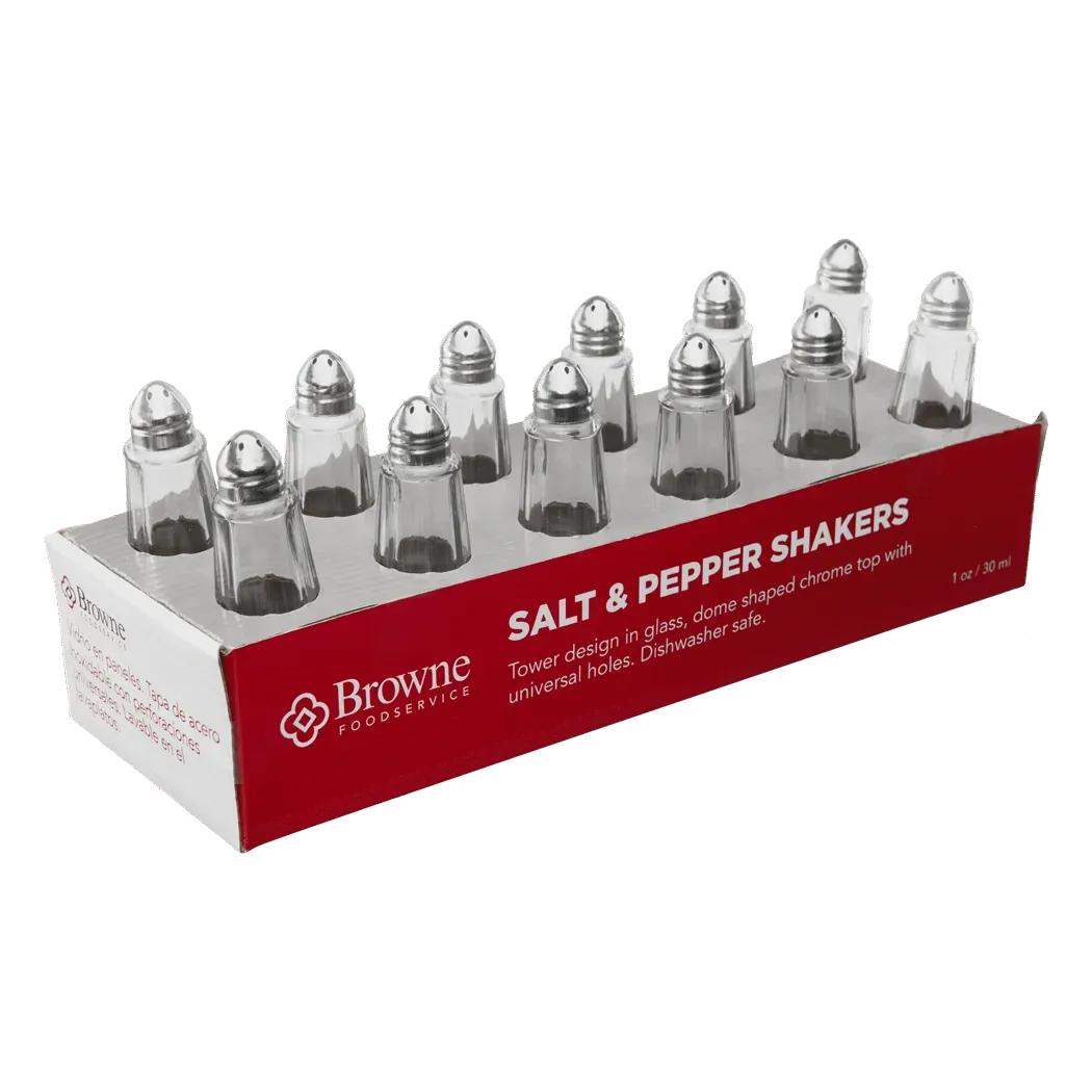Set apart with innovative solutions, Browne Foodservice presents the 575221 Tabletop Accessories - Shakers & Pourers. This sleek and functional set is perfect for commercial restaurant use. Each set includes 12 glass shakers with chrome tops, providing a stylish and durable solution for seasoning and pouring. With a capacity of 1oz/30ml, these shakers are ideal for accurately dispensing salt, pepper, or other spices. The compact tower design ensures easy storage and accessibility, saving valuable countertop space. Made by Browne Foodservice, a trusted name in the industry, this set is packed with attention to detail and quality. Whether you're a chef, bartender, or restaurant owner, the Browne Foodservice 575221 Tabletop Accessories - Shakers & Pourers will elevate your dining experience and impress your guests. Enhance your restaurant's efficiency and style with this essential accessory.