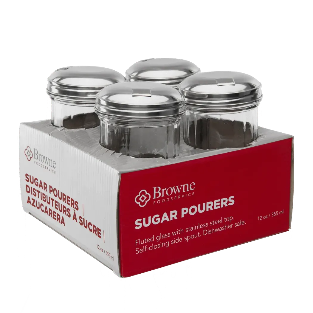 Stay at the forefront with top-tier tools like the Browne Foodservice, 575228 Tabletop Accessories - Shakers & Pourers. Designed for commercial restaurant use, this set of 4 sugar pourers is a must-have for any dining establishment. Each pourer features a 12oz/355ml glass container with a stainless steel top, ensuring durability and longevity. The side-flap design allows for easy pouring and prevents spills, making it convenient for busy restaurant environments. With Browne Foodservice's reputation for quality, you can trust that these pourers will withstand the demands of a commercial kitchen. Whether you're serving coffee, tea, or cocktails, these pourers provide a stylish and efficient way to dispense sugar to your customers. Enhance your restaurant's tabletop presentation and streamline your service with the Browne Foodservice, 575228 Tabletop Accessories - Shakers & Pourers.