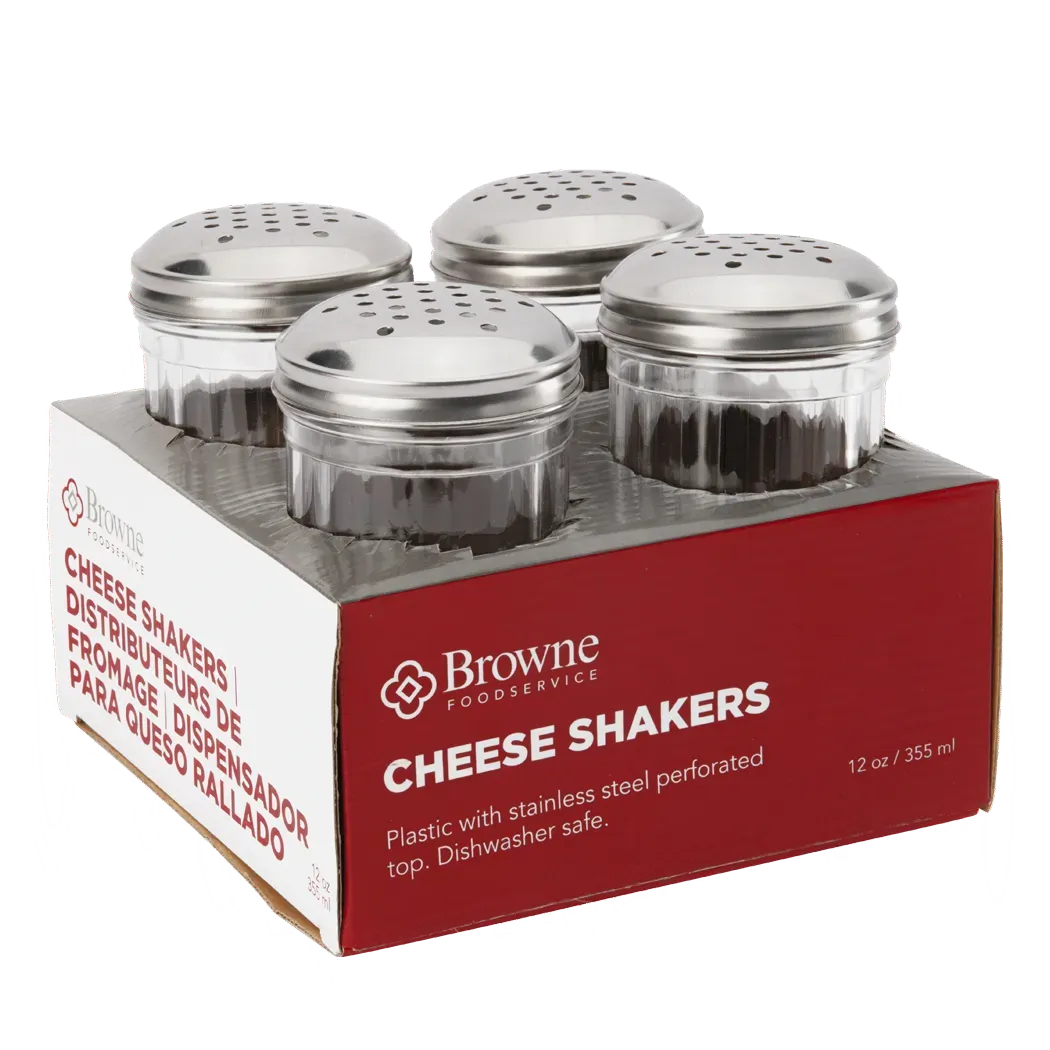 Set standards with a variety of equipment with Browne Foodservice's Tabletop Accessories - Shakers & Pourers. This versatile product, model number 575233, is a must-have for any commercial restaurant. The cheese shaker, made of durable plastic with a stainless steel top, comes in a convenient set of four, each holding 12 ounces (355ml) of cheese. Whether you're sprinkling parmesan on pasta or adding a finishing touch to a pizza, this shaker ensures a controlled and even distribution of cheese every time. The Browne Foodservice cheese shaker is designed to withstand the demands of a busy kitchen, making it perfect for high-volume restaurants. Its sleek and professional appearance adds a touch of elegance to any tabletop, enhancing the dining experience for your customers. Don't compromise on quality and efficiency choose Browne Foodservice's Tabletop Accessories - Shakers & Pourers for your restaurant today.