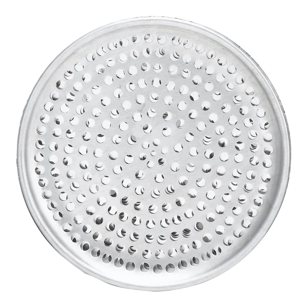 Maximize productivity in the kitchen with Browne Foodservice's Pizza Tray Aluminum 17"/43.2cm - Perforated. Designed specifically for commercial restaurant use, this pizza tray is a must-have for any pizzeria or Italian eatery. The perforated design allows for optimal heat circulation, resulting in a perfectly crispy crust every time. Made from durable aluminum, this tray is built to withstand the demands of a busy kitchen, ensuring long-lasting performance. With a diameter of 17 inches, it can accommodate large pizzas, making it ideal for serving hungry customers. Whether you're baking classic margherita or experimenting with unique toppings, this pizza tray will help you create delicious masterpieces that will keep your customers coming back for more.