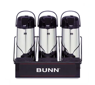 Transform your commercial restaurant into a space of efficiency with the Bunn 25371.0003 Airpot Serving Rack. Designed by Bunn, a trusted vendor in the industry, this serving rack is perfect for busy establishments. With a capacity for three airpots, it allows you to conveniently store and serve multiple beverages at once. The push-button feature ensures easy dispensing, while the sponge-lined tray keeps your countertops clean and organized. This rack is specifically designed for commercial restaurant use, making it an essential addition to your establishment. Whether you're serving coffee, tea, or hot water, this airpot serving rack will streamline your operations and enhance your customers' experience. Don't compromise on efficiency choose the Bunn 25371.0003 Airpot Serving Rack for your commercial restaurant today.