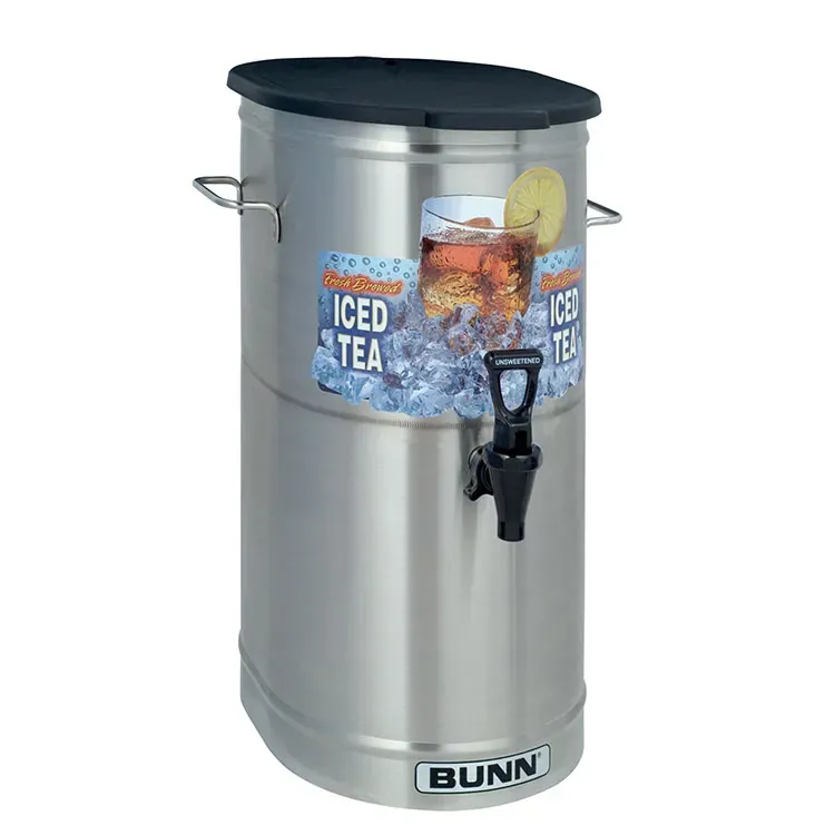 Optimize efficiency with quality tools. Introducing the Bunn 34100.0000 Tea / Coffee Dispenser, a must-have for any commercial restaurant. This cylinder-style dispenser boasts a generous 4-gallon capacity (15.1 liters), ensuring you can serve a large volume of refreshing iced tea or coffee to your customers. The sump dispense valve allows for easy and precise pouring, while the oval shape solid plastic lid keeps your beverages fresh and protected. With labeled faucet handles for sweetened and unsweetened options, your staff can effortlessly cater to every customer's preference. The side handles make transportation a breeze, allowing you to effortlessly move the dispenser from the kitchen to the dining area. NSF certified, this dispenser guarantees the highest standards of hygiene and safety. Upgrade your restaurant's beverage service with the Bunn 34100.0000 Tea / Coffee Dispenser and provide your customers with a delightful and efficient dining experience.