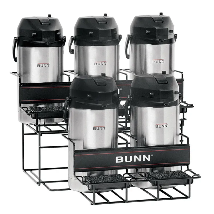Transform your commercial restaurant into a space of efficiency with the Bunn 35728.0004 Airpot Serving Rack. This versatile rack is designed to display and organize up to five push-button or lever-action airpots (not included), making it perfect for busy establishments. The carbon-steel wire construction ensures durability and longevity, while the sponge-lined tray keeps your airpots secure and prevents scratches. With two lower and three upper racks, this universal airpot rack maximizes your storage space and keeps your serving area neat and organized. Whether you're serving coffee, tea, or hot water, this Bunn airpot serving rack is a must-have for any commercial restaurant. Trust in Bunn, a reputable vendor known for their high-quality products. Upgrade your restaurant's efficiency and presentation with the Bunn 35728.0004 Airpot Serving Rack.