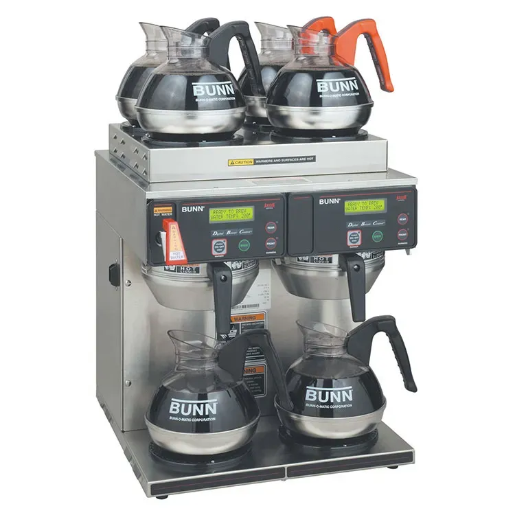 Enhance your commercial restaurant with the versatile Bunn 38700.0014 Coffee Brewer for Decanters. This double brewer is designed to meet the demands of a busy establishment, with a total capacity of 15 gallons per hour. The twin brew head system allows you to brew two batches simultaneously, ensuring a constant supply of fresh coffee. With 2 lower and 4 upper warmers, you can keep multiple decanters of coffee hot and ready for serving. The BrewWIZARD technology LCD display and touch pad make it easy to set the pot level and tank temperature, while the BrewLOGIC technology ensures consistent brewing results. The stainless steel construction not only adds durability but also gives a sleek and professional look to your coffee station. With its energy-saver mode and digital temperature control, this coffee brewer is both efficient and convenient. Trust Bunn, a reputable vendor in the industry, to provide you with a reliable and high-quality coffee brewing solution.