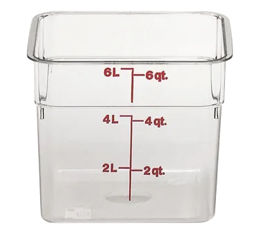 Upgrade your commercial restaurant's capabilities with the Cambro 6SFSCW135 Food/Beverage Storage Container. Designed by Cambro, a trusted vendor in the food and beverage storage industry, this container is a must-have for any professional kitchen. With a capacity of 6 quarts, it provides ample space to store and transport large quantities of food and beverages. The clear Camwear square design allows for easy visibility of contents, making inventory management a breeze. Made with durability in mind, this container is built to withstand the demands of a busy restaurant environment. Whether you need to store prepped ingredients, leftovers, or beverages, the Cambro 6SFSCW135 Food/Beverage Storage Container is the perfect solution for your commercial kitchen. Upgrade your storage capabilities today and experience the reliability and convenience this container has to offer.