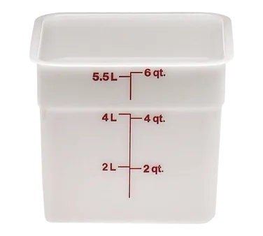 Innovate in the art of food service with Cambro's 6SFSP148 Food/Beverage Storage Container. Designed for commercial restaurant use, this square 6-quart poly white container is a must-have for any professional kitchen. The durable construction ensures long-lasting performance, while the tight-fitting lid keeps contents fresh and secure. Whether you're storing prepped ingredients, leftovers, or bulk supplies, this container is up to the task. Its stackable design saves valuable space in crowded kitchens, and the clear markings on the side make it easy to measure and portion ingredients accurately. Trust Cambro, a trusted name in food and beverage storage, to deliver the quality and reliability you need to streamline your restaurant operations. Upgrade your storage solutions with Cambro's 6SFSP148 Food/Beverage Storage Container.