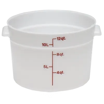 Stay ahead in the culinary landscape with Cambro's RFS12148 Food/Beverage Storage Container. Designed for commercial restaurant use, this round 12-quart poly white container is a must-have for any professional kitchen. The durable construction of this container guarantees long-lasting performance, even in the busiest kitchen environments. Its tight-sealing lid prevents leaks and spills, keeping your food secure during transportation. The stackable design allows for efficient storage, maximizing space in your kitchen. Whether you need to store prepped ingredients, leftovers, or bulk food items, this storage container is the perfect solution. Trust Cambro, a reputable vendor in the food and beverage storage industry, to provide you with high-quality products that meet the demands of your commercial restaurant. Upgrade your kitchen storage with Cambro's RFS12148 Food/Beverage Storage Container.