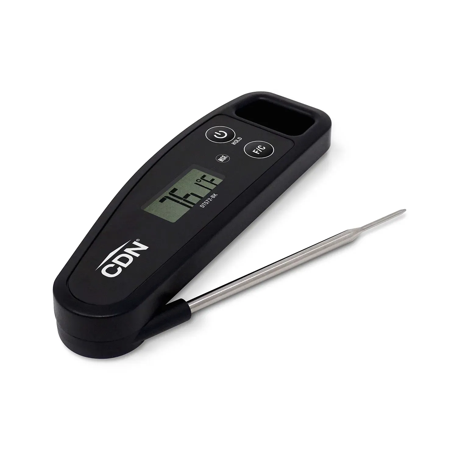 The CDN DT572-BK Digital Folding Thermometer - Black is perfect for use in any kitchen environment. Designed to provide accurate measurements in a temperature range from -58 to +572 F/-50 C to +300 C, this NSF Certified thermometer' s compact folding design for portability and probe protection when not in use. Perfect for any chef, this thermometer is made from food-safe plastic with a 1.7 mm thin tip on the stainless steel stem. It also has a hold mode, a waterproof rating of IPX6 and loop or magnet mounting abilities. From meats to chocolate, the oven or the freezer, whatever you need a temperature reading on, CDN has the thermometer for the task. Specializing in measurement tools, CDN produces the widest variety of thermometers, timers and scales on the market. Featuring advanced technology, quality construction, easy-to-read displays and user-friendly operations, CDN thermometers are essential tools in any kitchen. CDN covers the thermometer with a five-year limited warranty.