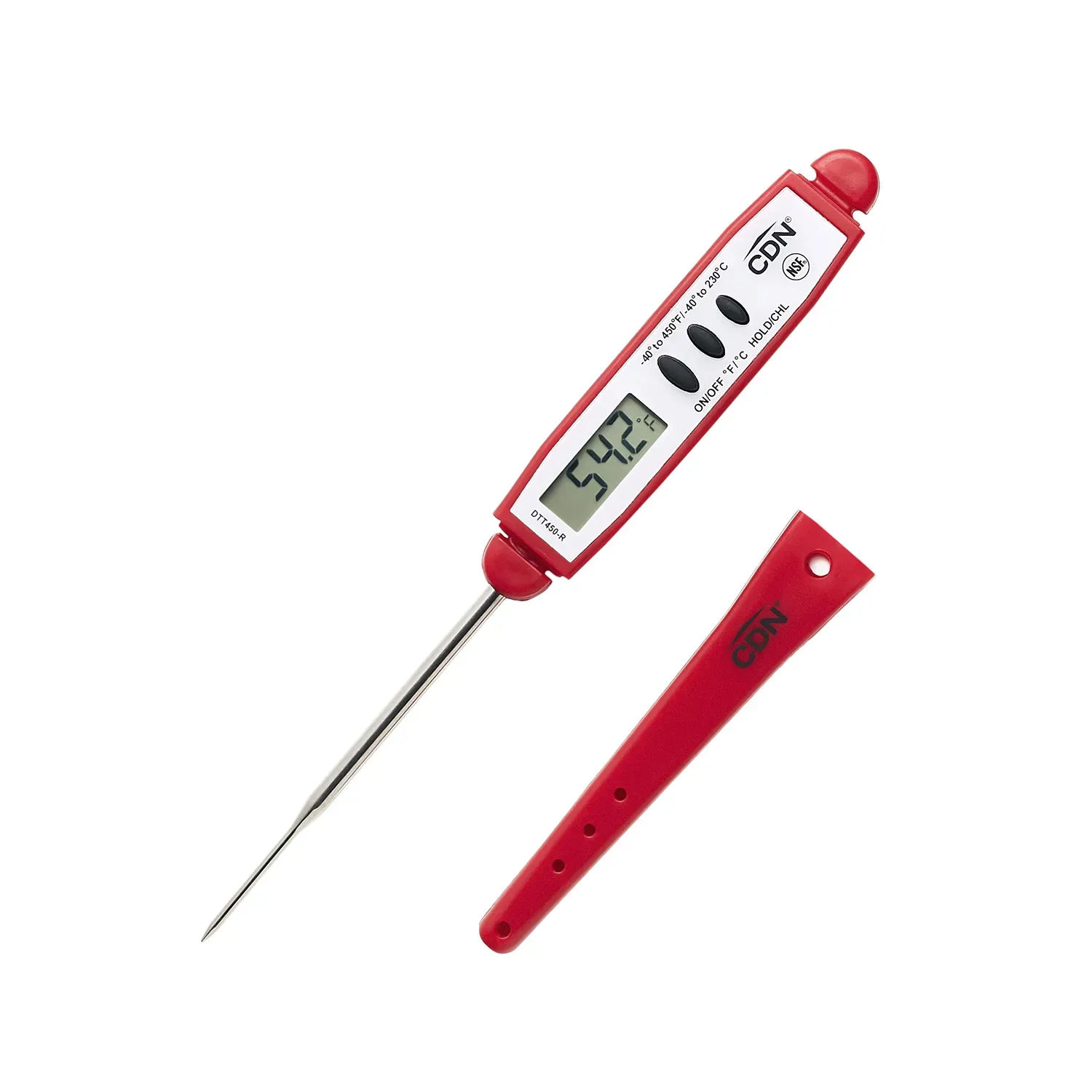 Introducing the CDN Measurement Tools DTT450-R, a must-have for commercial restaurants looking to optimize operations. This thin tip pocket thermometer in vibrant red is designed to withstand the demands of a busy kitchen. With a temperature range of -40 to +450°F/-40 to +230°C, this NSF certified thermometer delivers accurate readings in just 4 seconds. The 1.5 mm thin tip allows for precise measurements, while the 2.75" stainless steel stem ensures durability. The thermometer features a hold mode, field calibration, and a temperature guide for added convenience. Its shatterproof, food-safe ABS plastic construction with BioCote provides antimicrobial protection, making it ideal for HACCP compliance. The sheath can be used as a handle extension, and the pocket clip/hook allows for easy storage. With the CDN Measurement Tools DTT450-R, you can ensure food safety, maintain quality, and streamline your restaurant's operations.