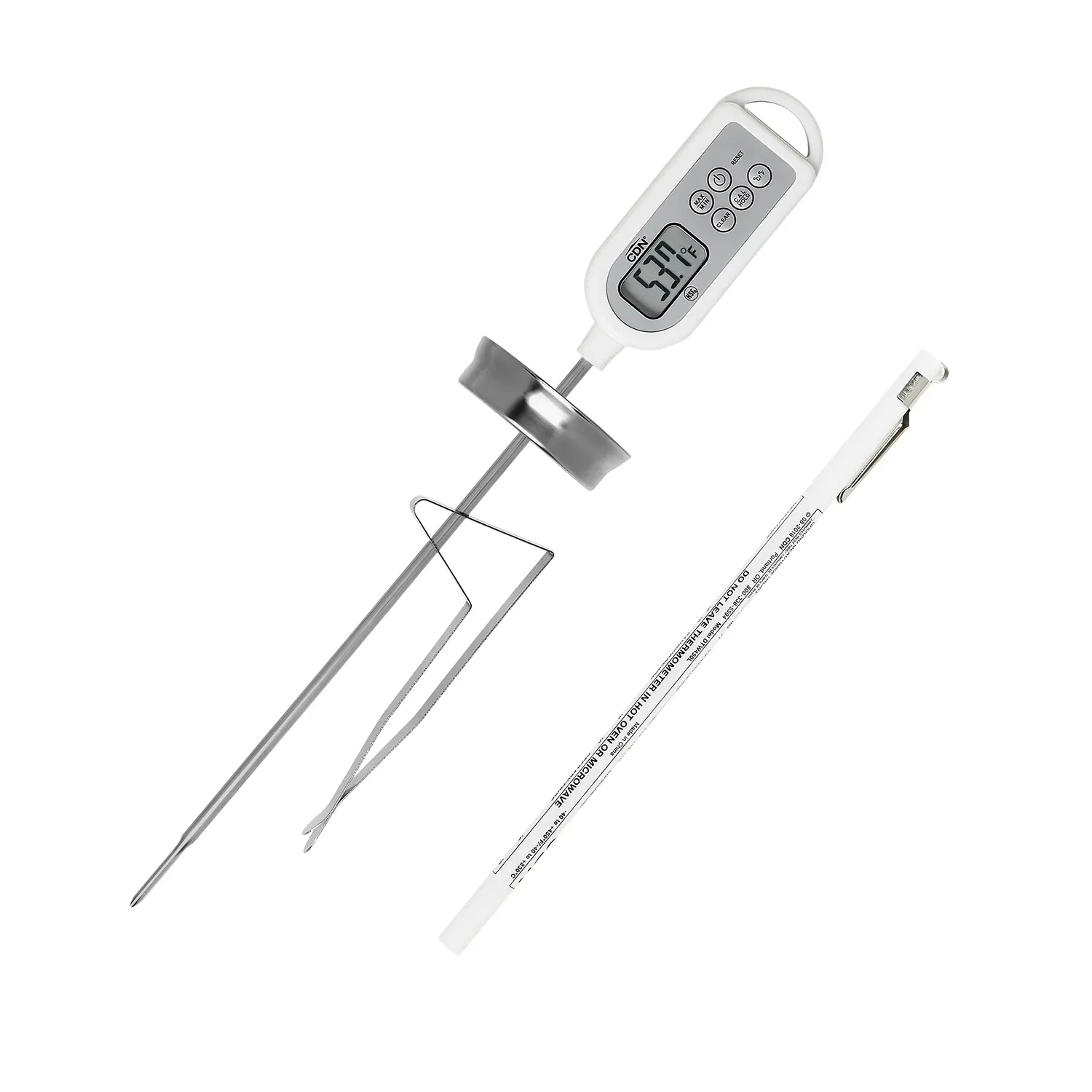 Introducing the CDN Measurement Tools DTW450L, a digital waterproof long stem thermometer designed to improve efficiency in commercial restaurant settings. With its -40 to +450°F/-40 to +230°C temperature range, this NSF certified thermometer ensures accurate readings for a variety of culinary applications. The 6-second response time and 2.5 mm thin tip allow for quick and precise measurements, while the hold mode and max/min mode provide added convenience. The thermometer's field calibration feature ensures ongoing accuracy, and its dishwasher-safe, shatterproof design (IPX7) guarantees durability in busy kitchen environments. The high heat shield and adjustable stainless steel vessel clip make it easy to use in various cooking vessels, while the pocket clip/hook allows for convenient storage. Crafted from food-safe ABS plastic with BioCote and a 304 stainless steel stem, this thermometer is both reliable and hygienic. Upgrade your restaurant's temperature monitoring with the CDN Measurement Tools DTW450L.