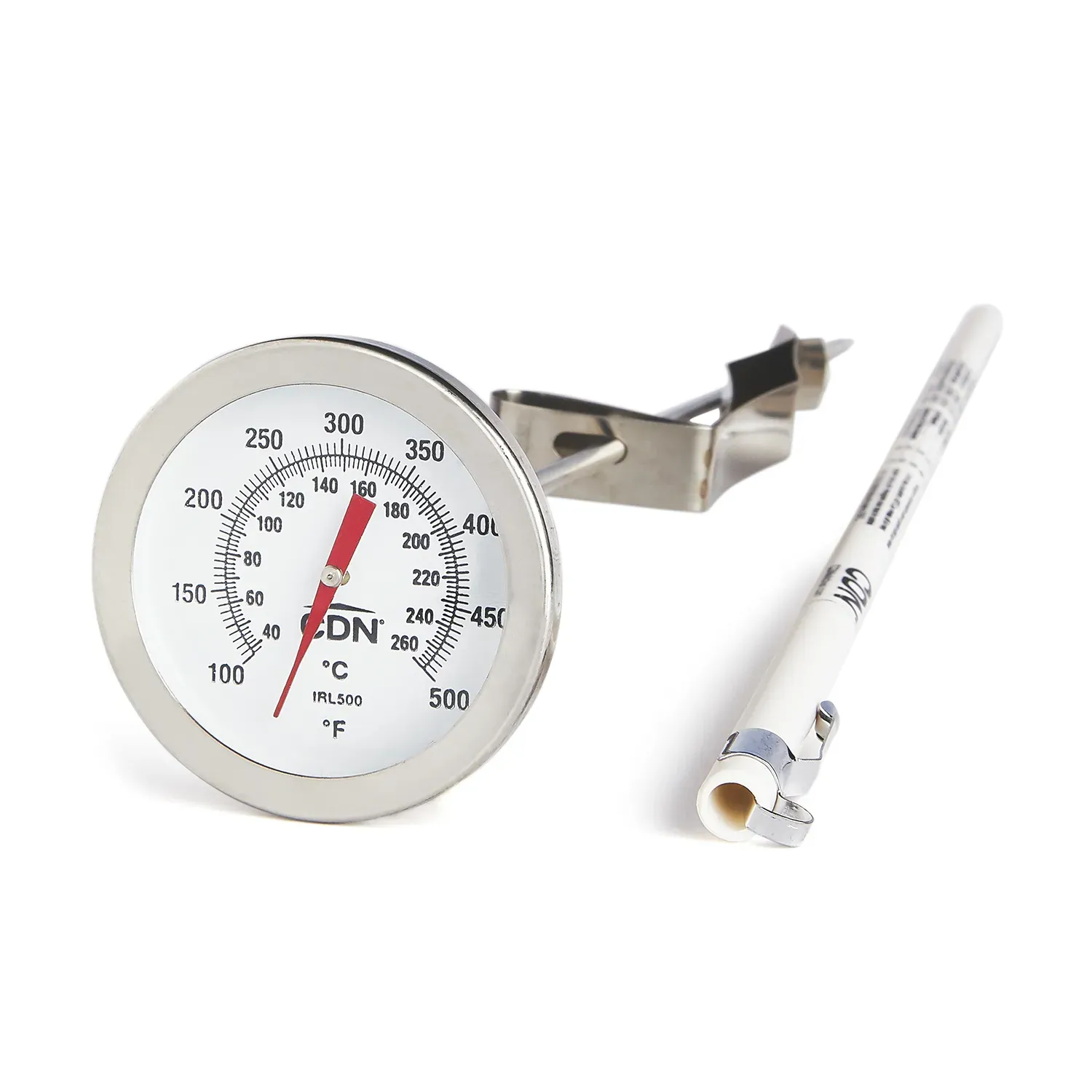 Modernize your restaurant's efficiency with the CDN Measurement Tools IRL500 Long Stem Fry Thermometer. Designed specifically for commercial restaurant use, this thermometer is a must-have for any professional kitchen. With a temperature range of 100 to 500º (38 to 260ºC), it ensures accurate readings for all your frying needs. The 1.75-inch dial and 12-inch stem provide easy-to-read measurements, while the durable laboratory glass lens and 304 stainless steel housing guarantee long-lasting performance. The sheath can also be used as a handle extension, allowing for safe and comfortable use. Additionally, the exclusive adjustable stainless steel vessel clip ensures secure attachment to your cooking vessel. Whether you're frying up crispy chicken or perfecting your signature tempura, the CDN Measurement Tools IRL500 is the ideal tool to help you achieve consistent and delicious results every time.