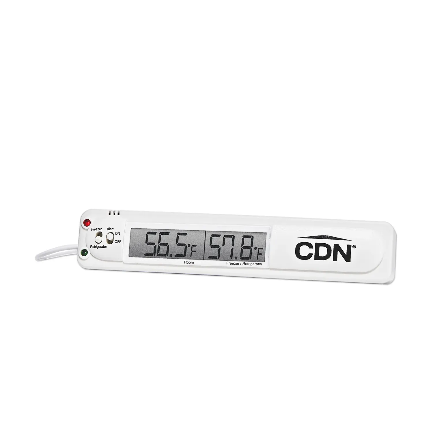 Boost your commercial restaurant's efficiency and food safety with the CDN Measurement Tools TA20 Thermometer. This reliable device is designed specifically for refrigerator and freezer use, ensuring that your perishable items are stored at the optimal temperature. With a temperature range of -58 to +158°F (-50 to +70°C), this thermometer provides accurate readings to help you maintain the freshness of your ingredients. The audio/visual alarm alerts you when the temperature reaches 15° or 45°F (-9.4° or 7.2°C), allowing you to take immediate action to prevent spoilage. The large display shows both room and refrigerator/freezer temperatures, providing you with real-time information at a glance. Made with shatterproof ABS plastic and equipped with a 39" sensor cable, this thermometer is durable and versatile. The sliding mode switch and Velcro/suction mounting options make it easy to install and use. Trust CDN Measurement Tools to keep your restaurant's food storage at its best.