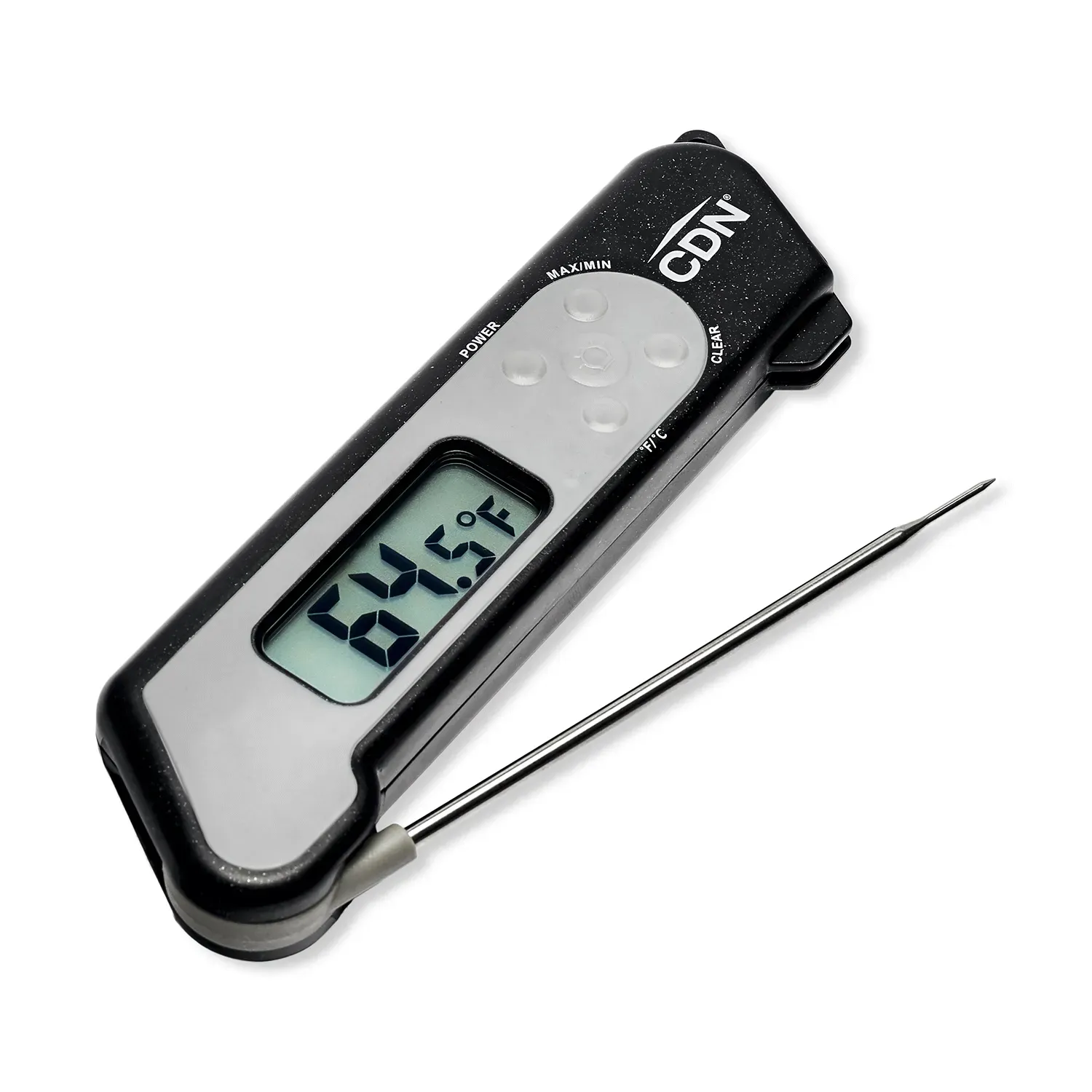 Introducing the CDN Measurement Tools TCT572-BK Thermocouple Folding Thermometer, the perfect tool for commercial restaurant use. With its sleek black design and thin tip, this thermometer is not only stylish but also highly functional. It has a temperature range of -58 to +572°F/-50 to +300°C, allowing you to accurately measure the temperature of various dishes. The NSF certification ensures that this thermometer meets the highest standards of food safety. The backlit blue display and extra big digit make it easy to read in any lighting condition. The 3-second response time and field calibration feature ensure quick and accurate measurements. Made with shatterproof and food-safe ABS plastic with BioCote, this thermometer is durable and hygienic. The 4.25" stainless steel probe is perfect for reaching deep into pots and pans. With its auto-off function and included CR2032 lithium button batteries, this thermometer is convenient and ready to use. Upgrade your restaurant's temperature measurement capabilities with the CDN Measurement Tools TCT572-BK Thermocouple Folding Thermometer.