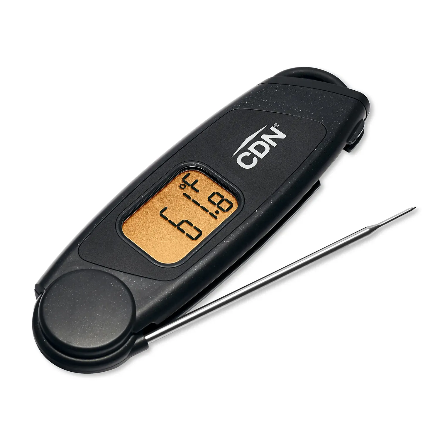 Transform accuracy with CDN Measurement Tools, TCTW572-BK Thermometer. Designed for commercial restaurant use, this waterproof folding thermocouple thermometer ensures precise temperature readings from -58 to +572°F/-50 to +300°C. Its NSF certification guarantees its reliability and safety in food preparation. The thermometer features a 360° rotating display and a 2-second response time, allowing for easy and quick temperature checks. The 1.5 mm thin tip and 4.33"/11 cm probe make it ideal for measuring the internal temperature of various dishes. The backlit amber display ensures visibility in any lighting condition. With field calibration and an automatic on/off function, this thermometer is convenient and user-friendly. Made with food-safe ABS plastic with BioCote and a 304 stainless steel probe, it is durable and easy to clean. The temperature guide on the thermometer provides additional assistance. Get accurate temperature measurements effortlessly with CDN Measurement Tools, TCTW572-BK Thermometer.