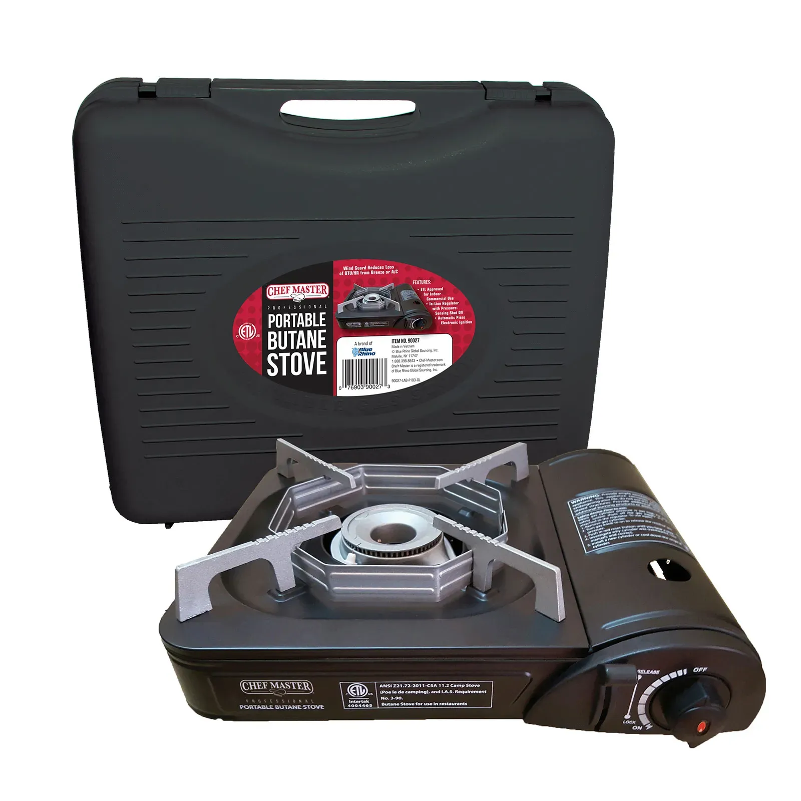 Introducing the Chef Master 90027 Butane Stove, designed to optimize kitchen workflow in commercial restaurants. This portable stove is a game-changer, offering adjustable heat ranging from a rapid boil to a gentle simmer. With an in-line regulator featuring pressure sensing shut off, you can cook with confidence, knowing that safety is a top priority. The automatic piezo electronic ignition ensures hassle-free operation, while the wind guard protects the flame from gusts, making it perfect for outdoor use as well. ETL certified for quality assurance, this stove comes with a high impact carrying case for easy transportation. Whether you need an extra burner during peak hours or a portable cooking solution for off-site events, the Chef Master 90027 Butane Stove is the reliable and efficient choice for commercial restaurant use.