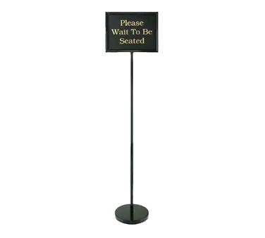 Introducing the Chef Master 90033 Sign, Freestanding, designed to innovate your food service. This freestanding sign is a must-have for any commercial restaurant, offering convenience and versatility. With its aluminum frame, steel pole, and steel base, this sign is built to withstand the demands of a busy restaurant environment. The sign features eight double-sided 11" x 14" P.V.C. signs, each silk screened with gold messages, including 15 pre-printed options and one blank for customization. The signs can be easily stored within the frame, ensuring they are always on hand when needed. The sleek black finish adds a touch of sophistication to any establishment. Whether you want to advertise daily specials, promote upcoming events, or simply welcome guests, the Chef Master 90033 Sign, Freestanding, is the perfect solution. Elevate your restaurant's visibility and attract customers with this high-quality, user-friendly sign.