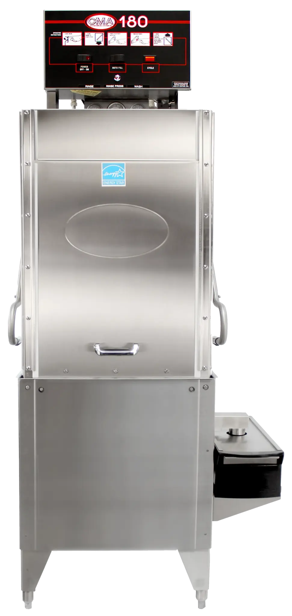 Discover kitchen perfection with the CMA Dishmachines, 180TallS, Dishwasher, Door Type. This high-quality pot and pan dishwasher is designed to meet the demands of a busy commercial restaurant. With its straight-thru design and top-mounted control box, it offers convenience and efficiency in one package. The split-door design provides a generous 27" dish clearance, allowing for easy loading and unloading. The built-in chemical resistant 7kW tank heater ensures optimal sanitization, while the automatic soil purging system keeps the machine clean and ready for the next load. The dishwasher also features an external Poly Pro scrap accumulator, auto start/stop function, and automatic tank fill for seamless operation. Made of durable stainless steel construction, this dishwasher is built to last. With its impressive 60 racks per hour capacity, the CMA Dishmachines, 180TallS, Dishwasher, Door Type is the perfect addition to any commercial kitchen.