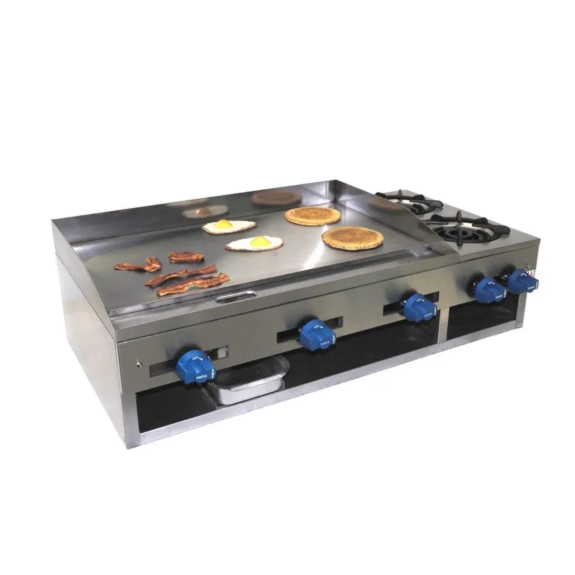 Invest in quality for a seamless cooking process with the Comstock-Castle 10301 Griddle / Hotplate. Designed for commercial restaurant use, this countertop gas unit is a versatile addition to any kitchen. With a 40" width and a 20" deep frame, it offers ample cooking space. The unit features two 12,000 BTU open burners, perfect for boiling, saut ing, and simmering. Additionally, it includes a 30" wide x 16" deep x 1/2" thick griddle plate, allowing you to cook pancakes, burgers, and more with ease. The five manual controls provide precise temperature adjustments, while the removable grease drawer ensures easy cleaning. Made with a stainless steel front and sides, this griddle/hotplate is durable and NSF certified. Enhance your restaurant's efficiency and productivity with the Comstock-Castle 10301 Griddle / Hotplate.