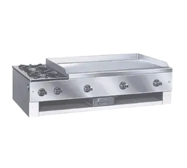 Crafting success in every culinary journey, Comstock-Castle presents the 10T202 Griddle/Hotplate. Designed for commercial restaurant use, this gas countertop unit is a versatile addition to any kitchen. With a 20" deep frame and a total width of 40", it offers ample cooking space. The unit features four 12,000 BTU open burners, allowing for precise heat control and efficient cooking. The 20" wide x 16" deep x 1/2" thick griddle plate provides a durable and even cooking surface. Equipped with a thermostat control and four manual controls, this griddle/hotplate ensures easy operation and consistent results. The removable grease drawer simplifies cleaning, while the stainless steel front and sides guarantee durability and a sleek appearance. With a powerful 72,000 BTU output, this NSF-certified unit is built to handle the demands of a busy commercial kitchen. Elevate your culinary creations with the Comstock-Castle 10T202 Griddle/Hotplate.