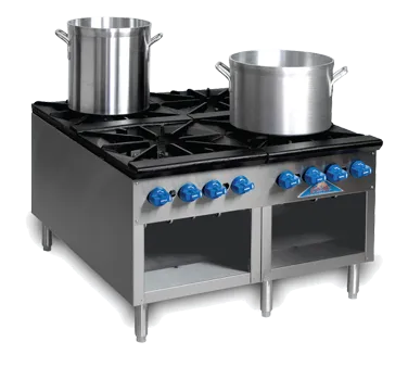 Create a culinary space of efficiency and excellence with the Comstock-Castle 2CSP36 Range. This gas stock pot range is designed for commercial restaurant use, offering a wide 36" surface to accommodate multiple pots and pans simultaneously. With its four double ring venturi cast iron burners, this range delivers a powerful heat output of 360,000 - 440,000 BTU, ensuring quick and efficient cooking. The manual control per section allows for precise temperature adjustments, while the open front cabinet base provides convenient storage for utensils and ingredients. The cast iron top grate and stainless steel exterior finish ensure durability and easy cleaning. NSF certified, this range meets the highest standards of safety and sanitation. Upgrade your kitchen with the Comstock-Castle 2CSP36 Range and experience the perfect blend of functionality and performance.