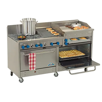 Stay competitive with innovative culinary solutions with the Comstock-Castle 2F330-2.5RB-30B Range. Designed for commercial restaurant use, this gas range offers exceptional performance and versatility. With a width of 72 inches, it features two 24,000 BTU star burners with 12-inch square cast iron grates, perfect for high-volume cooking. The range also includes a 30-inch raised griddle/cheesemelter with a 3/4-inch thick plate and two manual controls, allowing for precise temperature control. A stainless steel mesh flame spreader and a 24" x 18" rack below the griddle provide added convenience. Additionally, the range boasts a 30-inch char-broiler with angle iron radiants, perfect for achieving that delicious charred flavor. The two extra-wide 31-1/2" W x 21-1/2" D ovens with enamel bottom and door lining offer ample cooking space, with three rack positions for flexibility. With its stainless steel exterior, 7" backguard, and 6" stainless steel legs, this range is not only durable but also easy to clean. Stay ahead of the competition with the Comstock-Castle 2F330-2.5RB-30B Range.