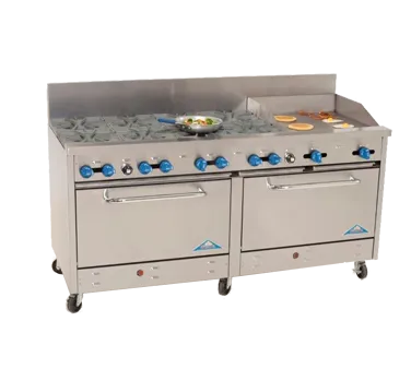 Introducing the Comstock-Castle 2F330-24 Range, the ultimate tool for seamless cooking in commercial restaurants. With its 72" width, this gas range provides ample space for preparing exceptional dishes. Equipped with eight 24000 BTU star burners and 12" square cast iron grates, it ensures precise heat distribution and efficient cooking. The range also features a 24" - 3/4" thick griddle with manual controls, perfect for preparing delicious breakfast items. The two extra-wide 31" ovens with enamel bottom and door lining offer versatility and durability, while the three rack positions allow for flexible cooking options. The stainless steel exterior finish adds a sleek and professional look to any kitchen. With a 292000 BTU rating, this range delivers powerful performance, making it a reliable choice for busy commercial kitchens. Trust Comstock-Castle for a range that exceeds expectations and elevates your culinary creations.