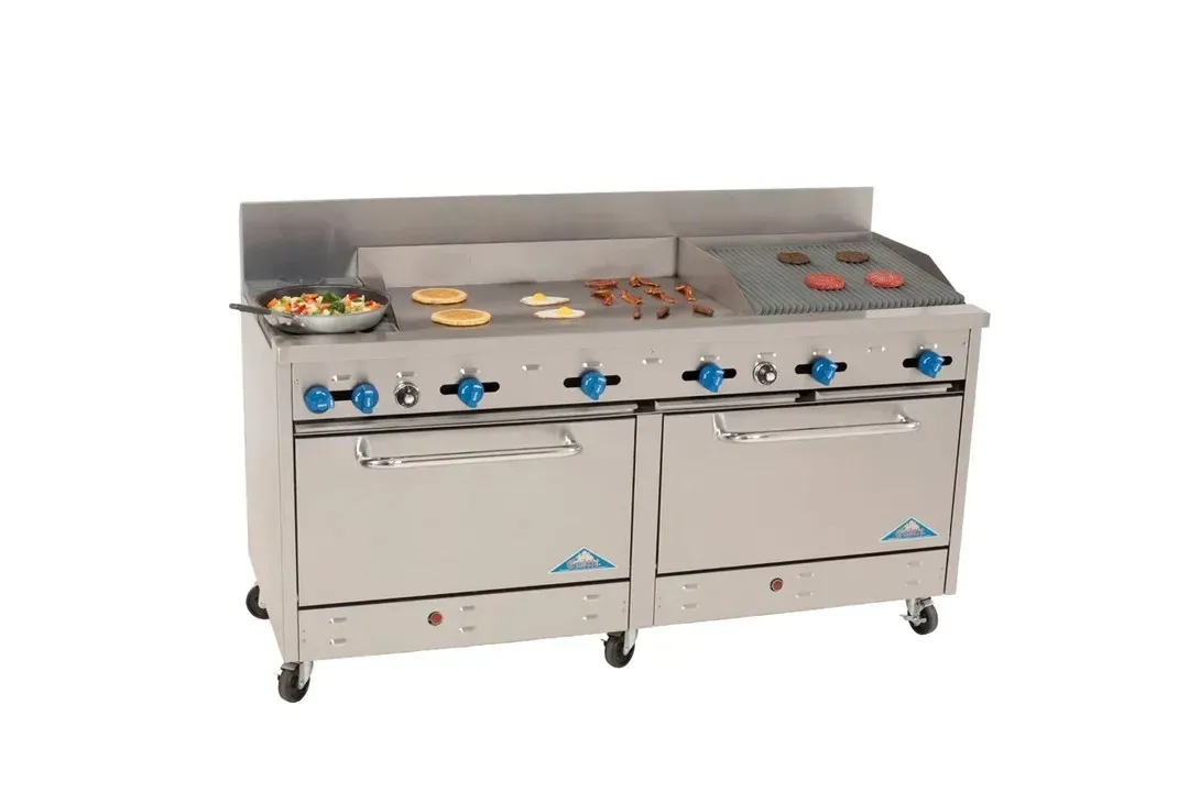 Elevate your culinary prowess with this premium 72" gas range, meticulously designed for professional kitchens seeking unparalleled performance and efficiency. This powerhouse of a range combines versatility and durability with its dual star burners, featuring a front burner with a robust 24,000 BTU and a rear burner packing an impressive 30,000 BTU, both supported by heavy-duty 12" square cast iron grates for optimal heat distribution. The 36" griddle, crafted with a 3/4" thick surface and manual controls, ensures precision cooking every time, while the 24" char-broiler with iron radiants delivers that perfect char and sear, ideal for grilling aficionados. Boasting two extra-wide 31" ovens with sleek enamel linings and three adjustable rack positions, this range offers ample space and flexibility to tackle any baking or roasting challenge. The stainless steel exterior, including a 7" backguard and sturdy 6" legs, not only promises durability but also adds a touch of sophistication to your kitchen. With a total output of 246,000 BTU and a 3/4" gas connection, this range is both NSF and ETL certified, assuring compliance with industry standards. Whether you're simmering, grilling, baking, or broiling, this range is the definitive choice for chefs who demand excellence and reliability in their culinary endeavors.