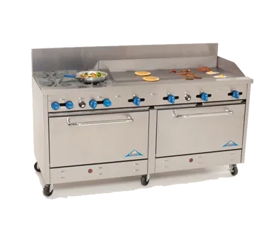 Elevate your culinary offerings with precision cooking gear. Introducing the Comstock-Castle 2F330-60 Range, a must-have for any commercial restaurant. This gas range is designed to meet the demands of a busy kitchen, with a generous 72" width and two powerful 24,000 BTU star burners. The 12" square cast iron grates provide even heat distribution and durability, while the 60" griddle with manual controls allows for versatile cooking options. The two extra-wide 31" ovens feature enamel bottom and door lining, ensuring easy cleaning and long-lasting performance. With three rack positions and a rack included per oven, you can cook multiple dishes simultaneously. The stainless steel exterior finish adds a sleek and professional look to your kitchen, while the high shelf provides additional storage space. With a 208,000 BTU rating, this range delivers exceptional cooking power. NSF and cETLus certified, this Comstock-Castle range is a reliable and efficient choice for any commercial restaurant.